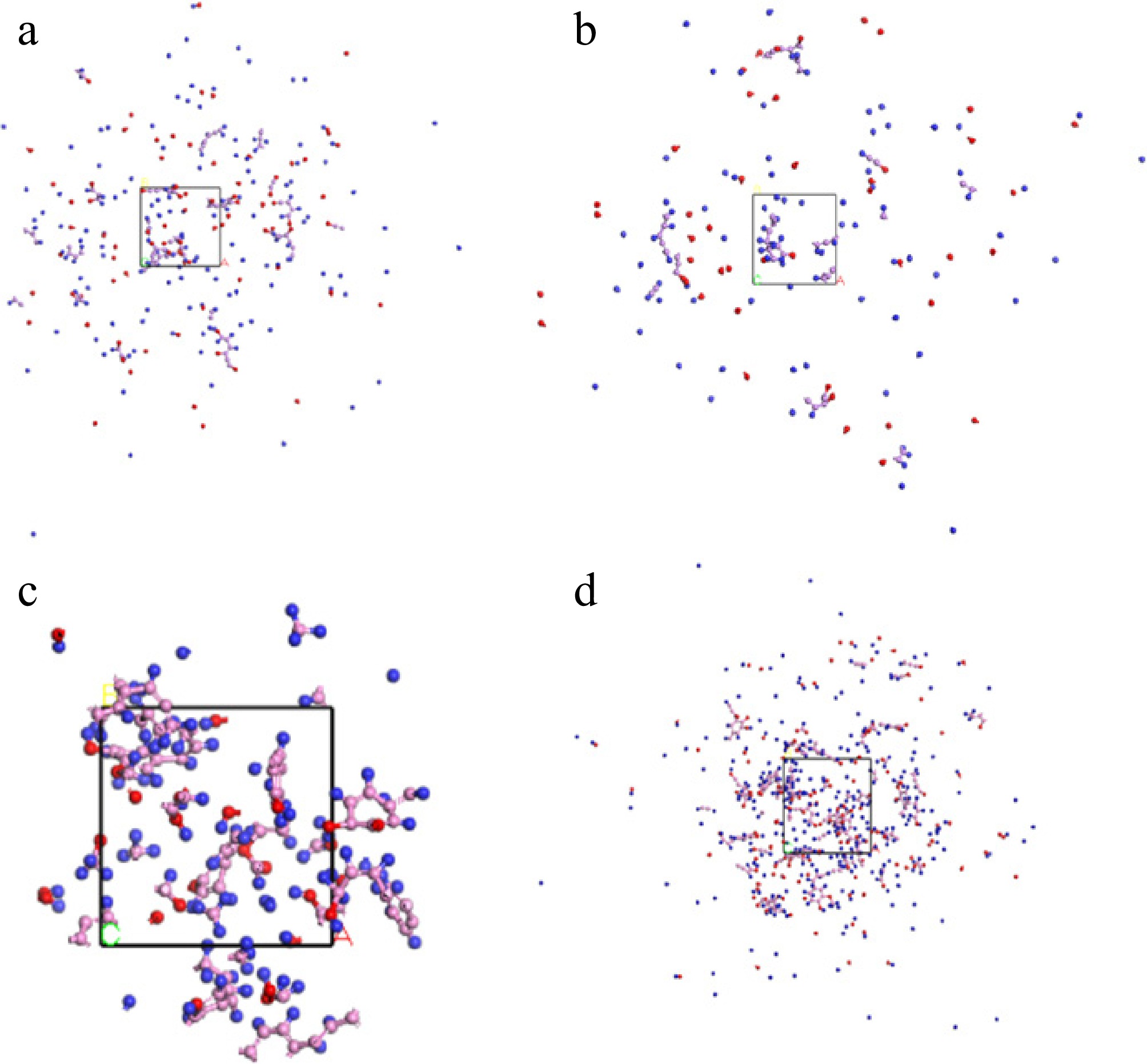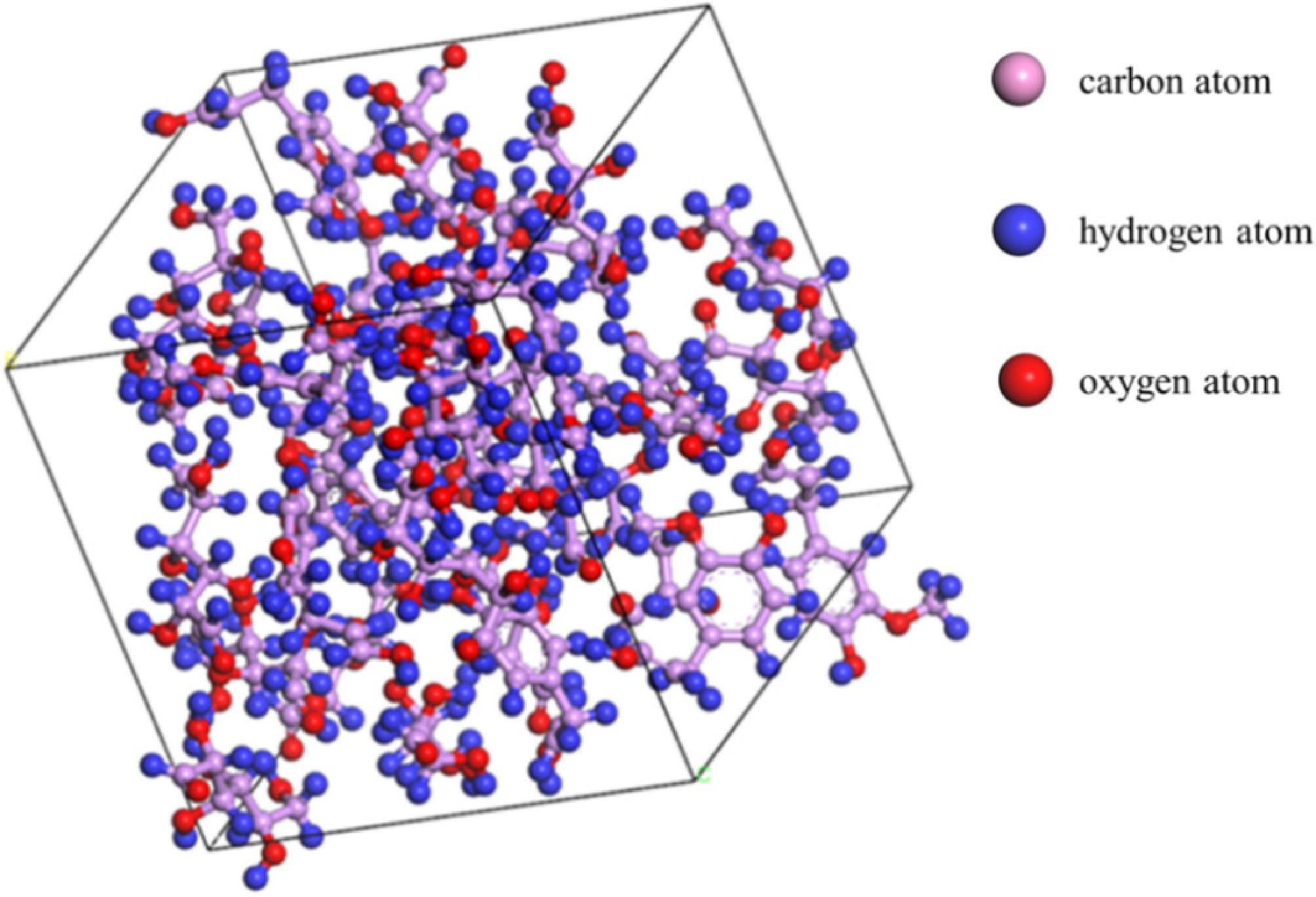 Based on the molecular formulae of the main components of bagasse, the monomer models were built separately using the Visualizer module, and these are shown in Fig. 1. The selected substances were then polymerized together at a temperature of 298 K using the AmorphousCell module. The module formed a three-dimensional periodic structure, which was constructed by an algorithm similar to the polymerization process, where molecules were 'grown' one by one into a simulation box. The cubic simulation box had a side length of 18.42 Å, and a density of 1.46 g/cm3. To rationalize the model structure, the aggregated model used the Forcite module to perform operations such as geometry optimization and annealing cycles. Annealing involves heating the molecules to a higher temperature, allowing the molecular structure to stretch and relax fully. The molecules were then cooled down to calculate the optimal structure. It allowed the global energy minimum to be reached, and the three-dimensional optimal structure to be obtained, achieving the most stable state without imaginary frequency. Imaginary frequencies were negative eigenvalues of the second-order derivative matrix of energy (Hessian matrix). In this direction of vibration, the architecture was at the maximum value of energy. Therefore, structures with imaginary frequencies were unstable structures. The annealing cycle was performed at temperatures between 300 K and 500 K, and the final model of the stable structure (denoted as Model A) was obtained using the NPT system. The model is shown in Fig. 2. and contains 219 C atoms, 366 H atoms, and 156 O atoms.