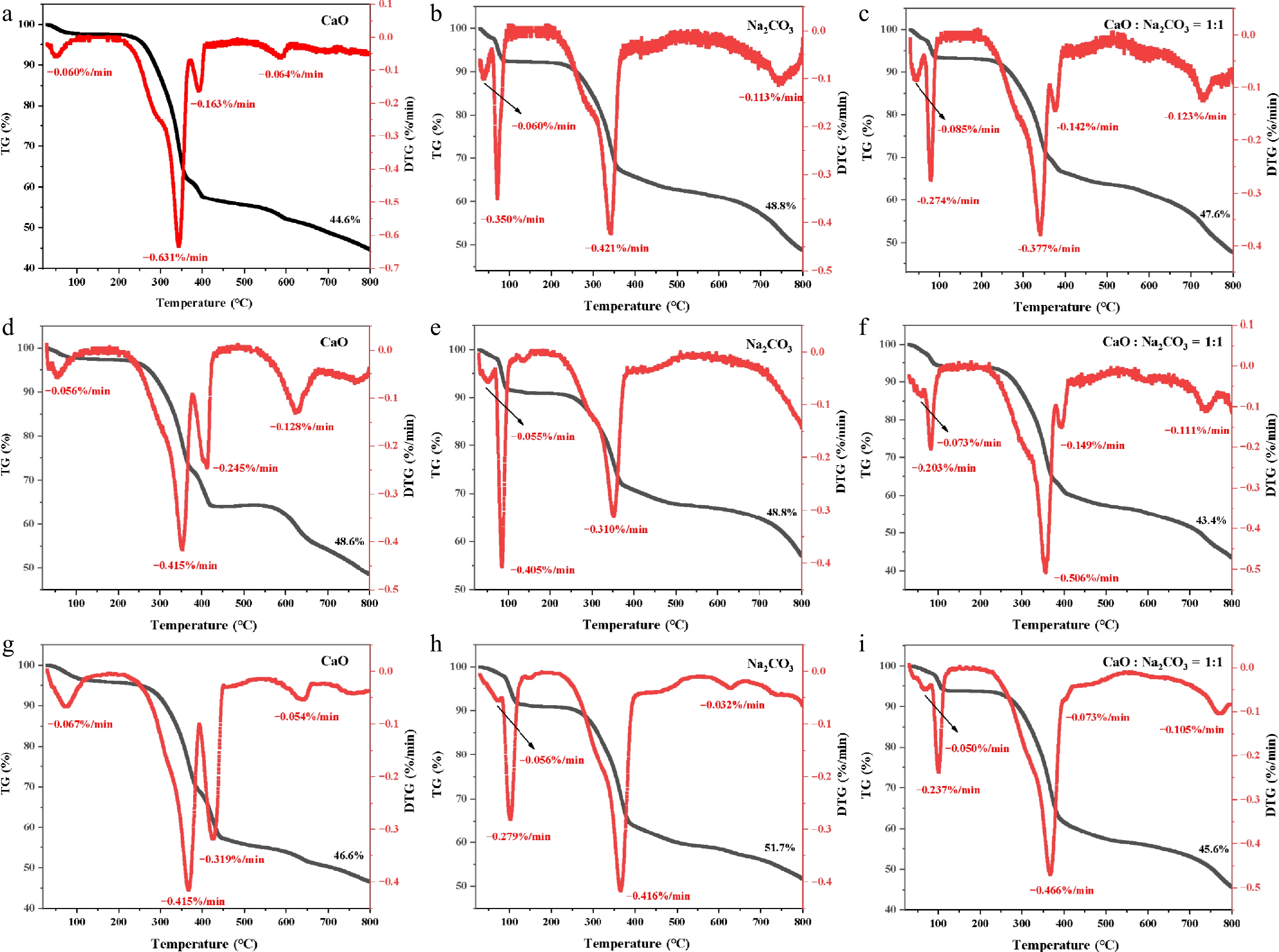 TG and DTG curves of bagasse and catalyst: (a) CaO, 5 °C/min; (b) Na2CO3, 5 °C/min; (c) CaO : Na2CO3 = 1:1, 5 °C/min; (d) CaO, 10 °C/min; (e) Na2CO3, 10 °C/min; (f) CaO : Na2CO3 = 1:1, 10 °C/min; (g) CaO, 20 °C/min; (h) Na2CO3, 20 °C/min; (i) CaO : Na2CO3 = 1:1, 20 °C/min.