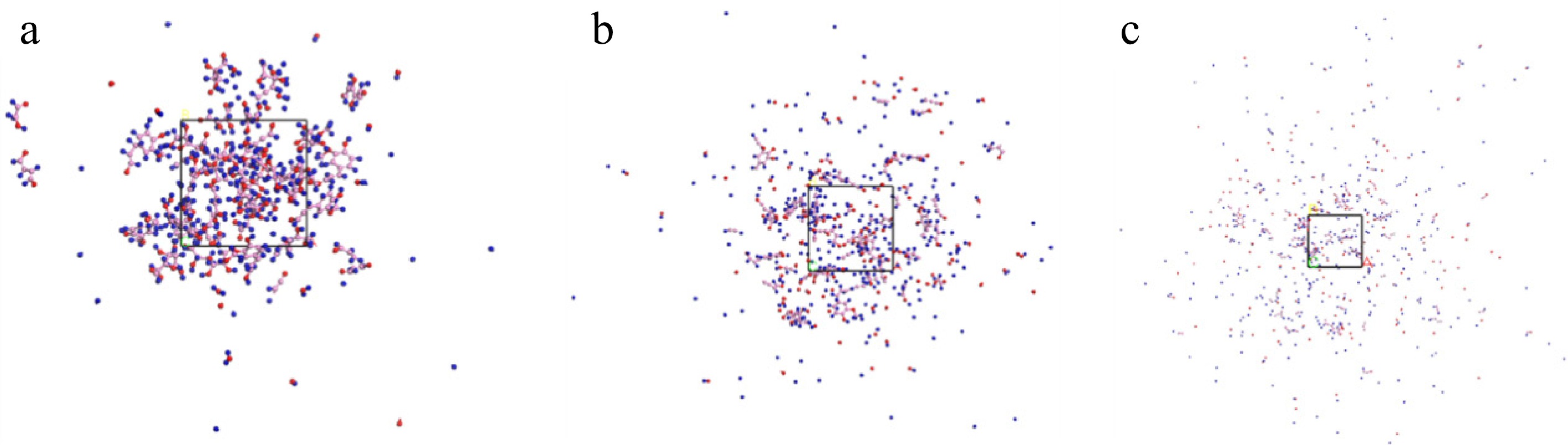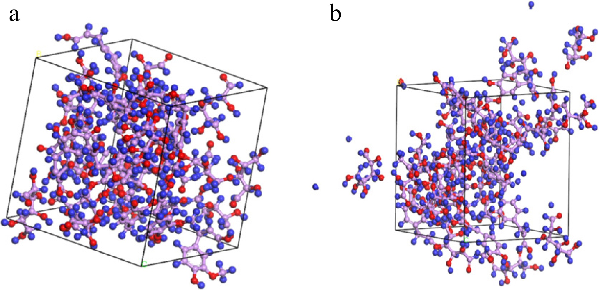For Model A, the ReaxFF force field and the NVT system were selected through the GULP module in Materials Studio 2020. The pyrolysis simulation was started at a temperature of 1,000 K and gradually increased until Model A had completely pyrolyzed into small molecules, and no macromolecular polymers remained. The products obtained at different temperatures were observed and identified. The pyrolysis results at five temperatures (1,000, 1,300, 1,500, 2,000, and 2,500 K) were selected for statistical analysis of the number of pyrolysis products. Due to limitations in current molecular dynamics software, the time step in the simulation was set to 1 fs, and the total simulation time to 100 ps. This ensured that the model received sufficient energy in a short period to initiate pyrolysis, resulting in a significantly higher simulated temperature than the actual temperature. However, according to molecular dynamics theory, temperature only affected the rate of a chemical reaction, not its chemical energy[21], and this kind of temperature setting was widely used in various heating simulations.