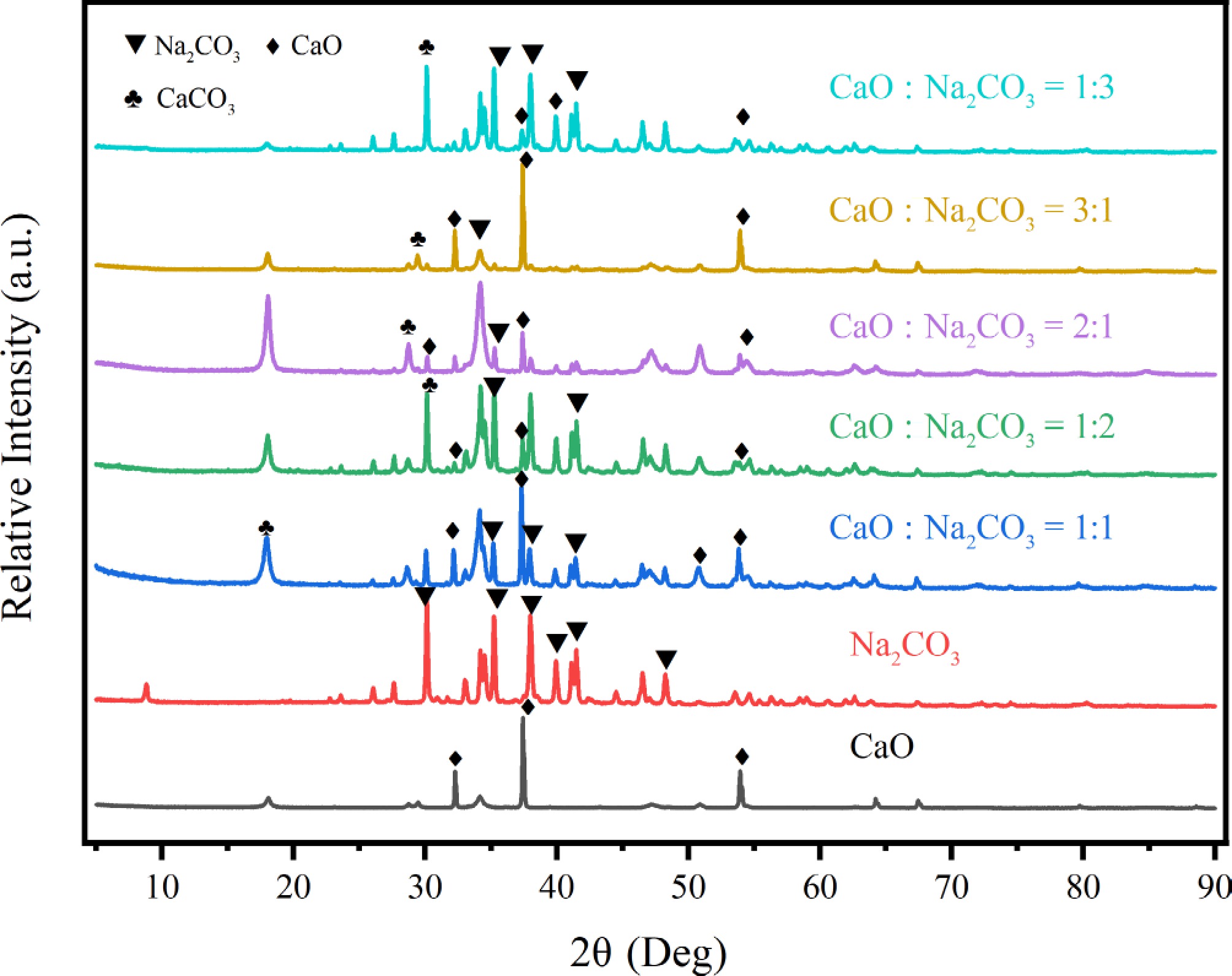 XRD was used to characterize all catalysts after pyrolysis, and the results are shown in Fig. 8. All the catalysts retained the typical crystal diffraction peaks of the carriers. The results show that the characteristic diffraction peaks of cubic CaO crystals appear at 2θ = 32.20, 37.36, and 53.86° (CaO: PDF#98-000-0284). The characteristic diffraction peaks of the monoclinic Na2CO3 crystal system appear at 2θ = 30.15, 34.44, 35.24, 38.00, 41.11, and 48.20° (Na2CO3: PDF#99-000-2592). When CaO and Na2CO3 were mixed in equal proportions for the pyrolysis experiments, a characteristic diffraction peak corresponding to CaCO3 was observed at 2θ = 17.72°. It indicated that CaO reacted with Na2CO3 during pyrolysis. The peaks gradually increased as the proportion of CaO increased, and the diffraction peaks shifted to the right. The diffraction peaks of CaO (32.2°) and Na2CO3 (30.1°) in the mixed catalysts were significantly weakened, and a new diffraction peak appeared near 35°. Ca-Na composite carbonated may form in the catalysts, and the generation of new substances could enhance microwave absorption. When CaO occupied a higher proportion in the mixed catalysts (3:1, 2:1), the characteristic diffraction peaks of CaCO3 appeared at 2θ = 29.4° and 2θ = 29.0°. When the proportion of Na2CO3 was high (1:3, 1:2), the characteristic diffraction peaks of CaCO3 appeared at 2θ = 30.4° and 2θ = 30.0°. The decomposition reaction of Na2CO3 at high temperature released CO2, and CaO combined with CO2 to form CaCO3, which led to the appearance of new diffraction peaks. So the diffraction peaks of CaO (32.2°) and Na2CO3 (30.1°) weakened.