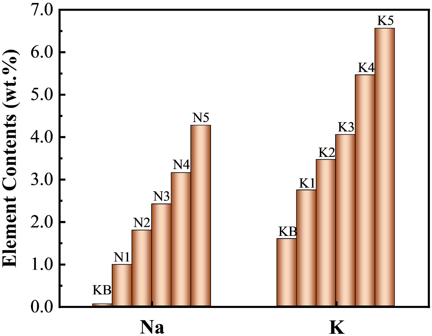 • Considering that the addition of a catalyst always has a significant influence on the catalytic effect, reconstituted tobacco sheets with K or Na doped at a range of concentrations were prepared. As shown in Fig. 1 and Supplementary Table S1, the real content of Na increased from 0.05 wt.% to 4.27 wt.% along with the increase in the impregnation concentration, reaching up to 85 times that of the KB sample. By contrast, the actual content of K changed from 1.59 wt.% to 6.56 wt.%, increasing fourfold. This difference was mainly caused by the difference between the Na and K content in the KB samples, which is caused by physiological changes and the composition of fertilizer applied to tobacco plants during growth[34].