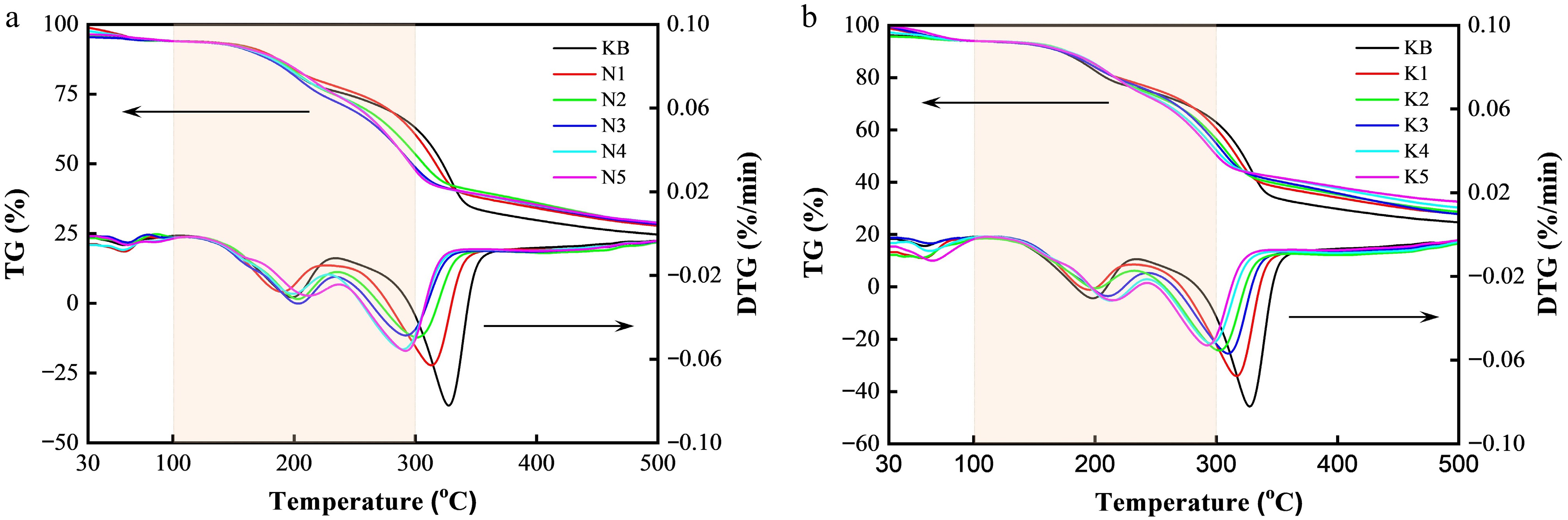 The thermogravimetric curves and characteristic temperatures of reconstituted tobacco sheets with added K are shown in Figs. 2b and 3d and Supplementary Table S2. The introduction of K had a similar level of catalytic activity to Na, resulting in the maximum weight loss rate appearing at lower temperatures as the added amount increased. This characteristic temperature gradually decreased from 328 °C for the KB sample to 292 °C for the K5 sample. At the same time, with an increase in the addition of K salt, the total weight loss at 100–300 °C increased from 31.11% to 43.57%. Therefore, the optimal catalytic effect can be achieved when the amount of K added is 5 wt.%.