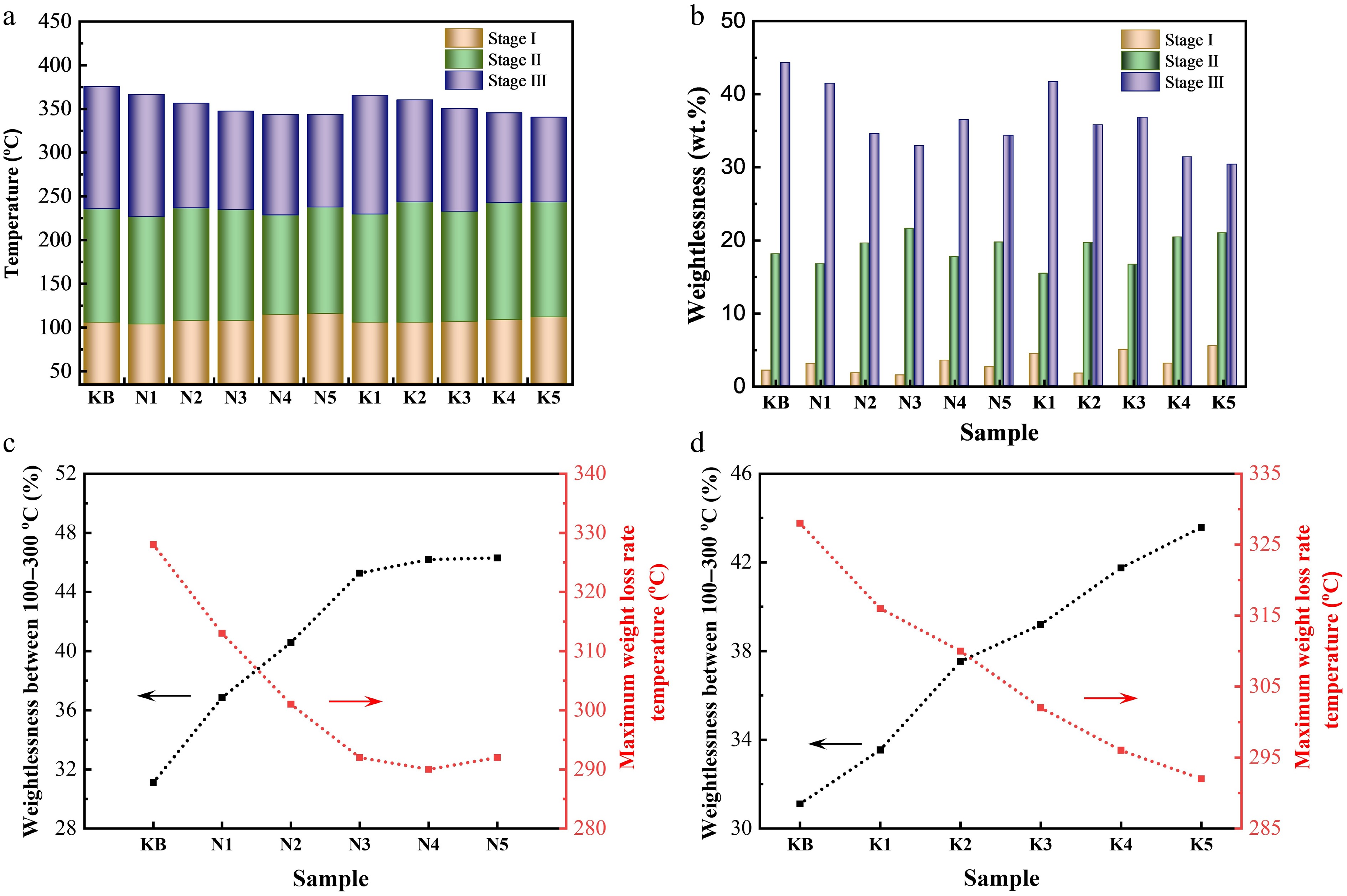 (a) Weight loss transition temperatures of reconstituted tobacco sheets during pyrolysis at 35–500 °C. (b) Weight loss of reconstituted tobacco sheets in weight loss Stages I–III. Weight loss (left) at 100–300 °C and maximum weight loss rate at temperatures below 500 °C (right) of reconstituted tobacco sheets with added (c) Na salt or (d) K salt.