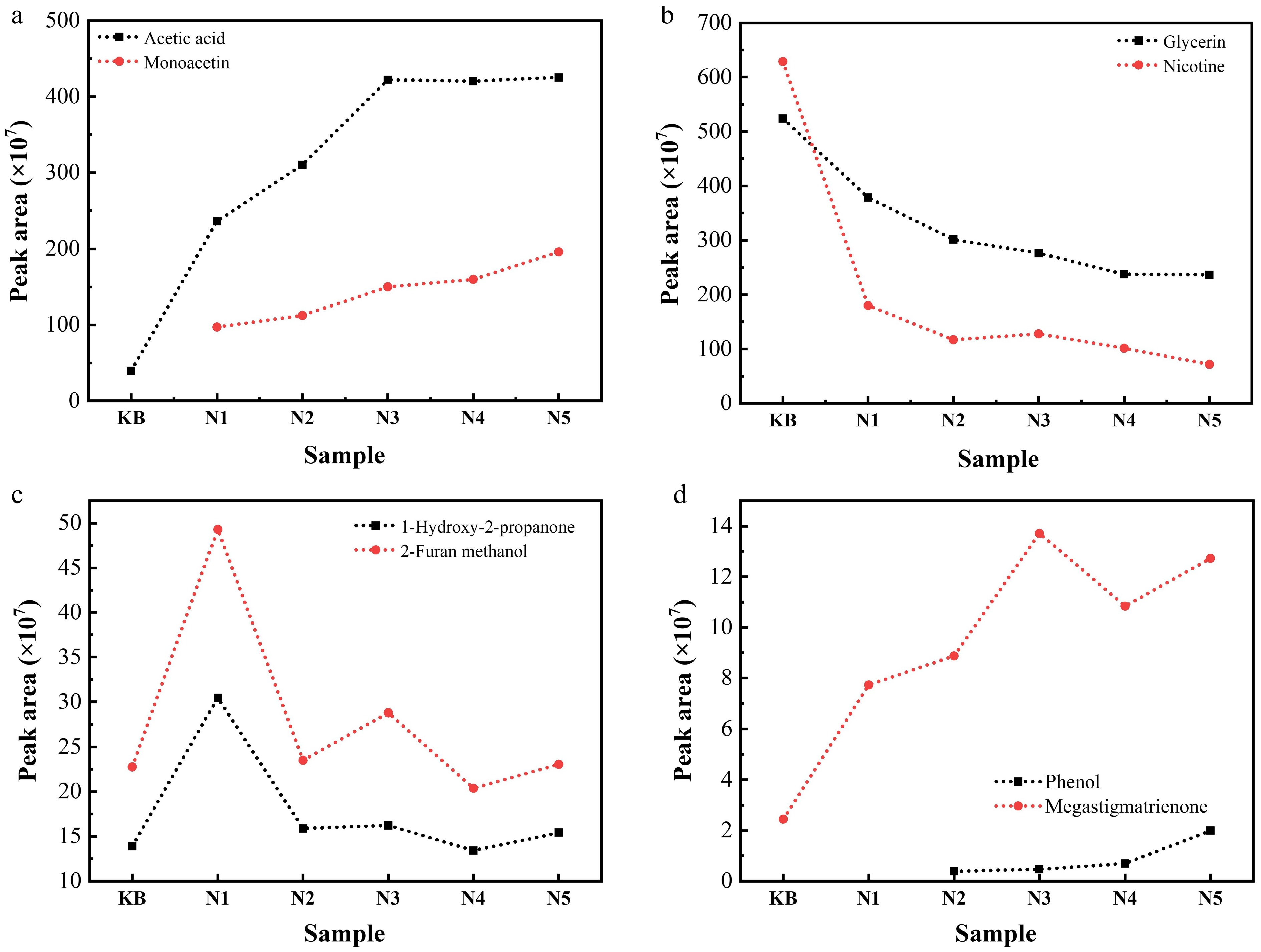 Contents of (a) acetic acid and monoacetin, (b) glycerin and nicotine, (c) 1-hydroxy-2-propanone and 2-furan methanol, and (d) phenol and megastigmatrienone in the pyrolysis gas of reconstituted tobacco sheets with different amounts of added Na salt at 300 °C (semiquantitative results represented by the peak area measured via Py-GC/MS).