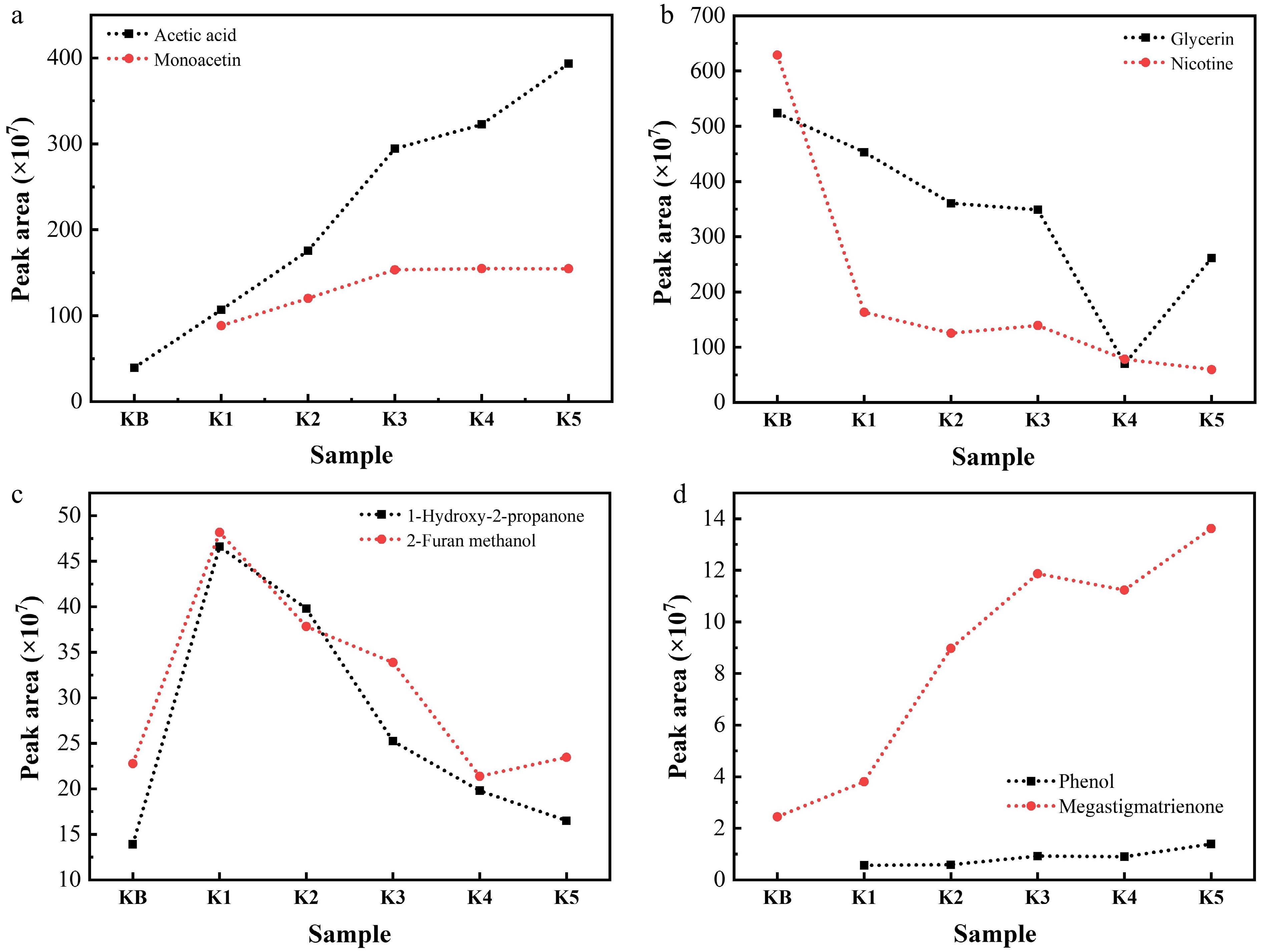 Contents of (a) acetic acid and monoacetin, (b) glycerin and nicotine, (c) 1-hydroxy-2-propanone and 2-furan methanol, and (d) phenol and megastigmatrienone in the pyrolysis gas of reconstituted tobacco sheets with different amounts of added K salt at 300 °C (semiquantitative restults represented by the peak area measured via Py-GC/MS).