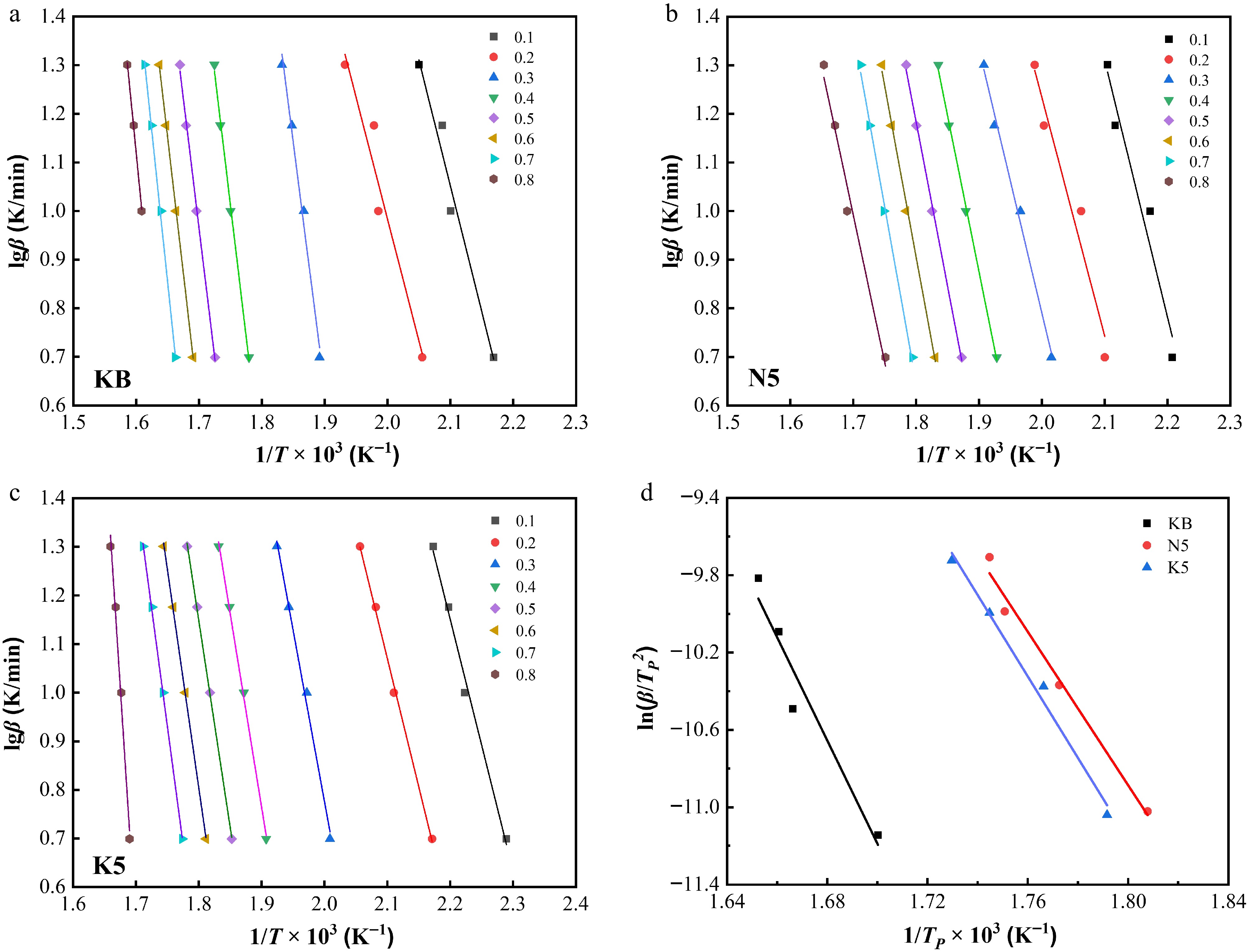 Linear relationships between lgβ and 1/T × 103 at different conversion ratios (α) for (a) the KB sample, (b) the N5 sample, and (c) the K5 sample. (d) Linear relationships between ln(β/TP2) and 1/TP × 103 for the KB sample, the N5 sample, and the K5 sample.