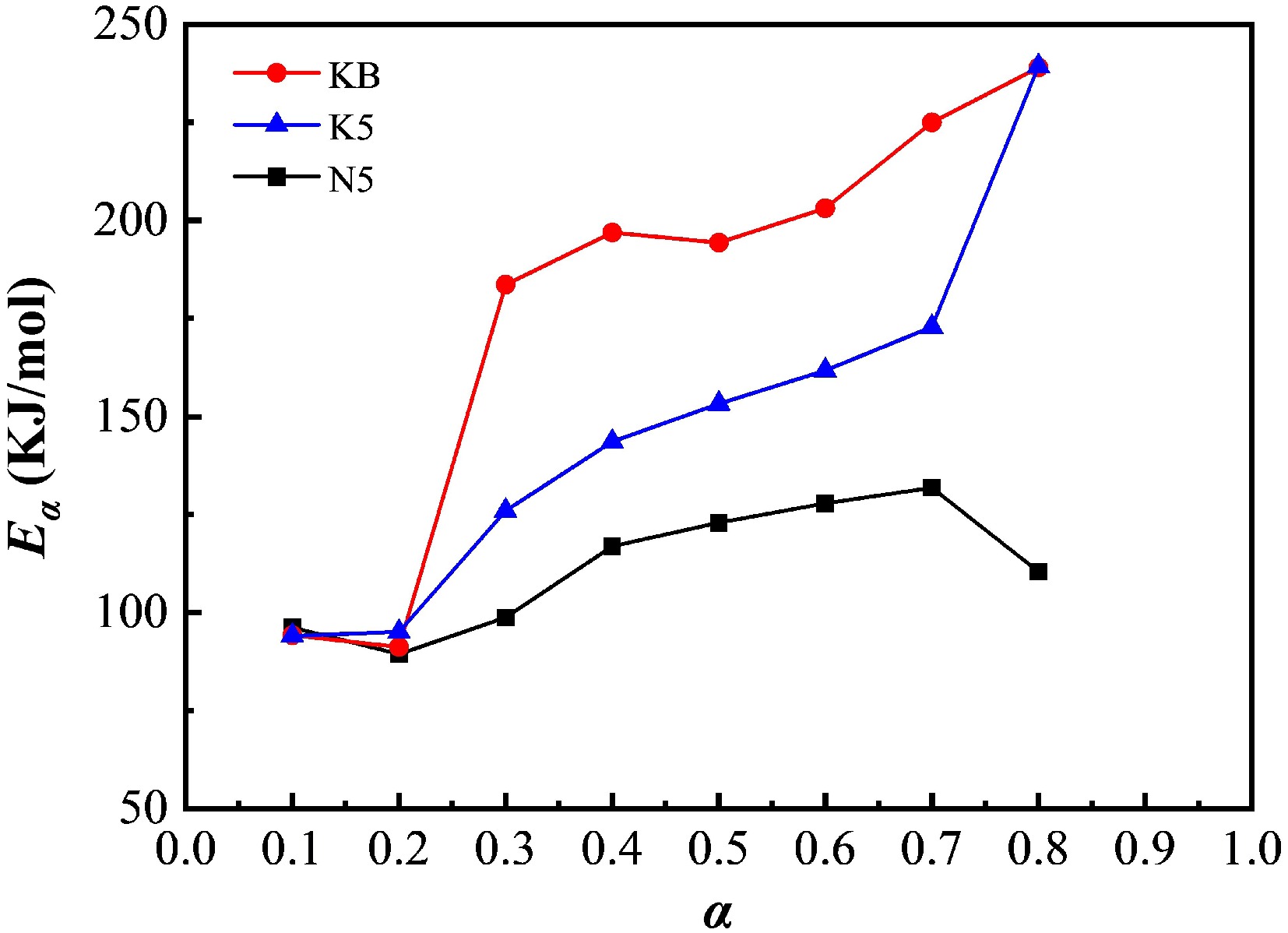 Eα for the pyrolysis of reconstituted tobacco sheets (KB, K5, N5) at different conversion ratios (α).
