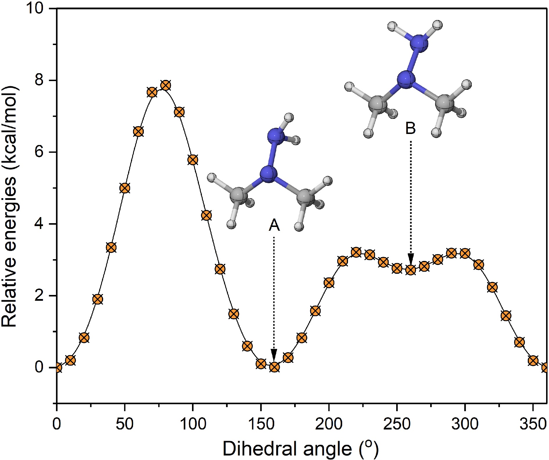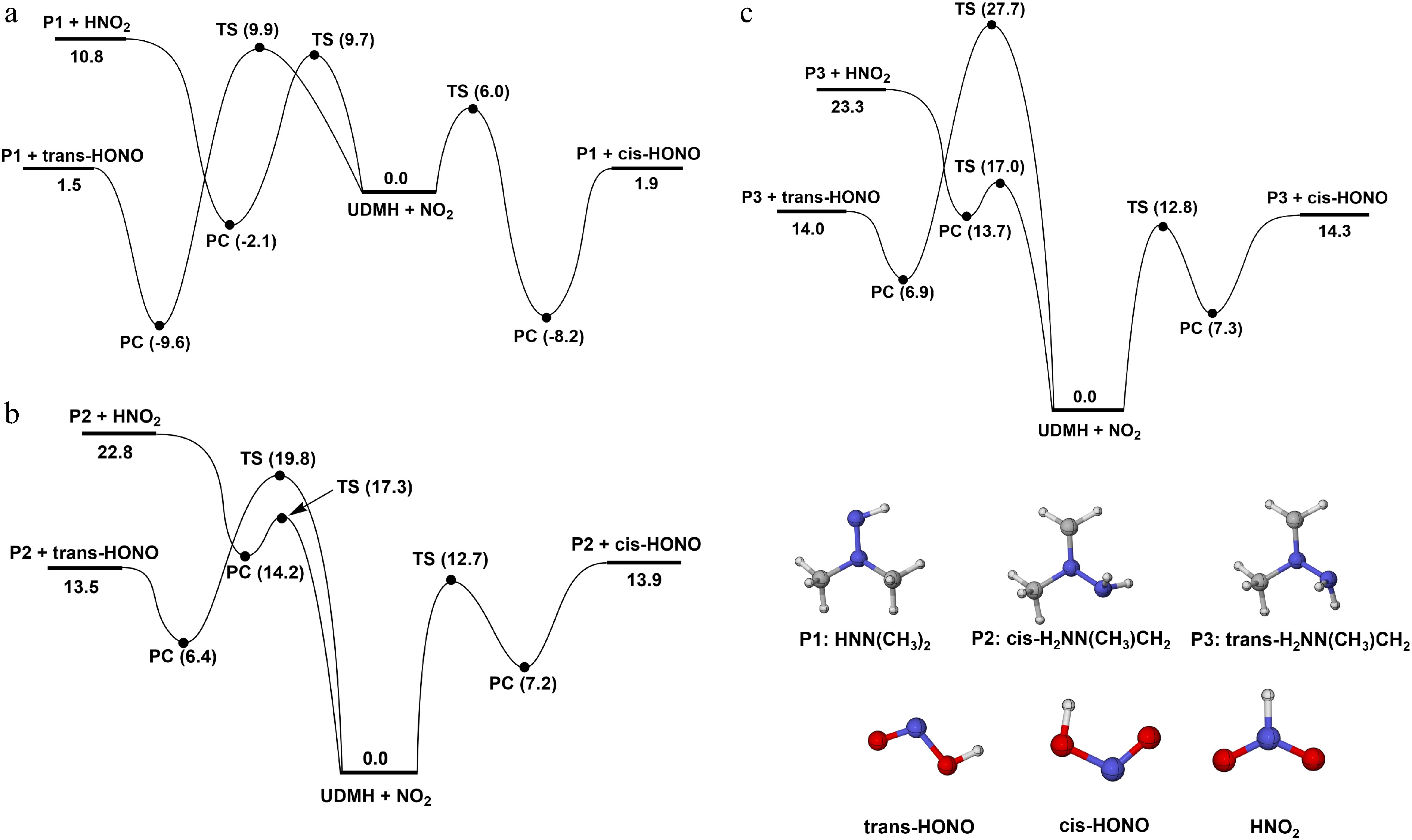 • The PESs for the H-abstraction reactions of UDMH by NO2 were calculated and the corresponding results are shown in Fig. 4. There are three kinds of H-abstraction sites, HNH2, Hcis-CH3, and Htrans-CH3 (Supplementary Fig. S17). It should be noted that differences in the CH3 group (cis-CH3 and trans-CH3), may influence the H-abstraction behavior, which will be discussed next. When NO2 attacks the amine group (HNH2) (Fig. 4a), there are three different reaction pathways. When the N atom of NO2 serves as the attacking atom, a product complex (PC) is produced through a transition state (TS), with a 9.7 kcal/mol energy barrier. Subsequently, an energy absorption of 12.9 kcal/mol is required in PC decomposition to produce NHN(CH3)2 and HNO2 radicals (R8). Notably, the products exhibit the energy of 1.1 kcal/mol, which is higher than that of the transition state. When the O atom of NO2 attacks HNH2 sites, there are two different reaction channels, NHN(CH3)2 + trans-HONO formation (R9), and NHN(CH3)2 + cis-HONO formation (R10). For these two reactions, the energy barriers stand at 9.9 and 6.0 kcal/mol, respectively. Then the PCs with relatively low energy of −9.6 and −8.2 kcal/mol, are formed. Finally, these PCs undergo decomposition reactions to form corresponding products.