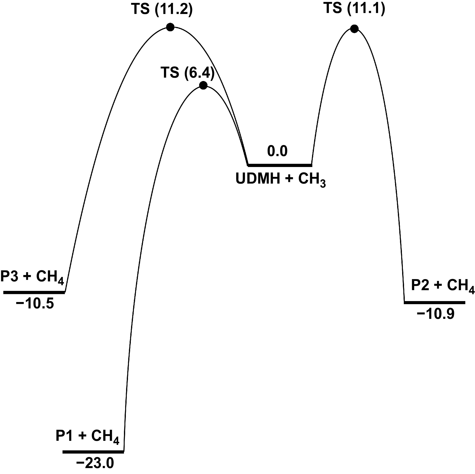 In addition to the four bond dissociation reactions, there are three types of elimination reactions caused by intramolecular H-migration to form N(CH3)CH2 + NH3 (R5), NN(CH3)2 + H2 (R6), and HNNCH3 + CH4 (R7), with energy barriers of 70.7, 71.2, and 109.3 kcal/mol (Fig. 2). However, for the production of NN(CH3)2 + H2, and HNNCH3 + CH4, energy absorption of 40.2 and 3.6 kcal/mol are needed, while the reaction for the production of N(CH3)CH2 + NH3, releases 13.3 kcal/mol of energy. Among these seven unimolecular decomposition reactions, CH3 and NH2 group dissociation reactions have relatively low energy barriers.