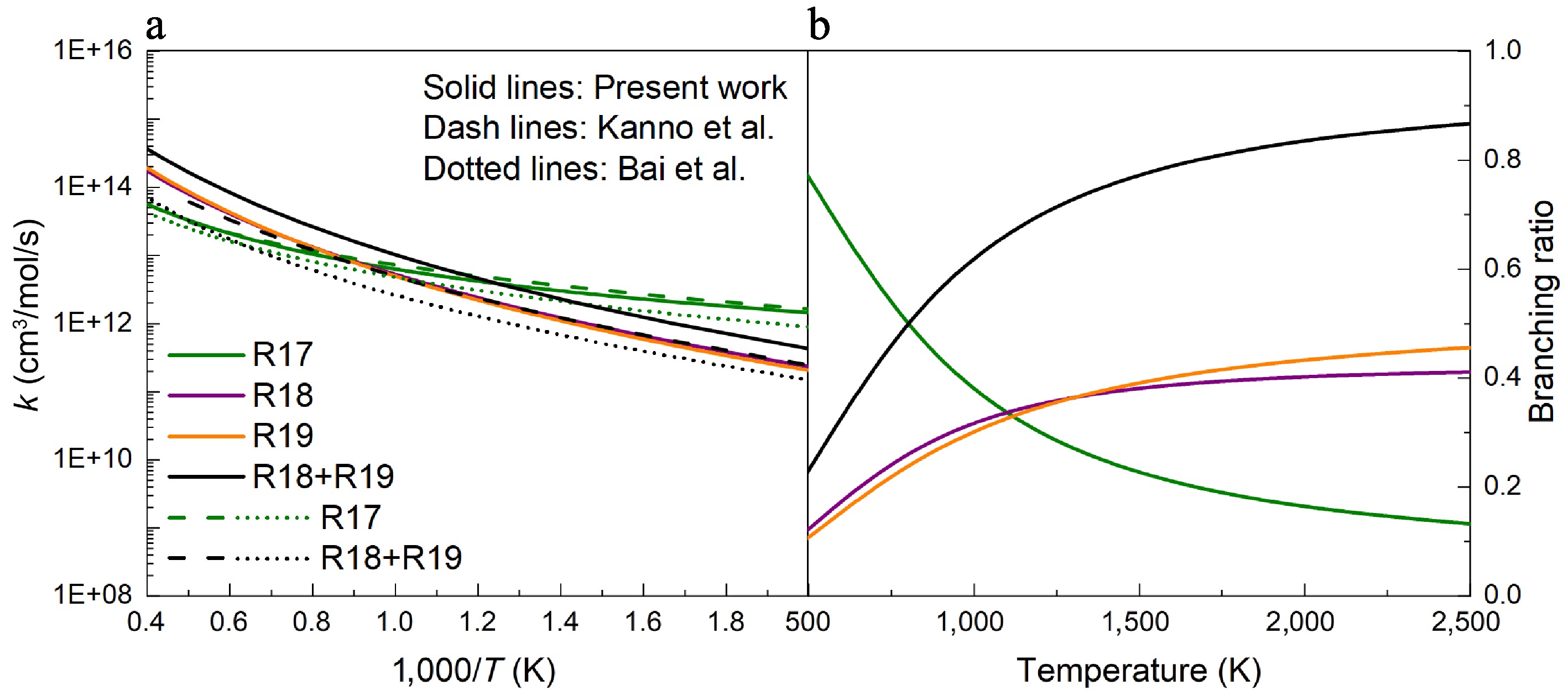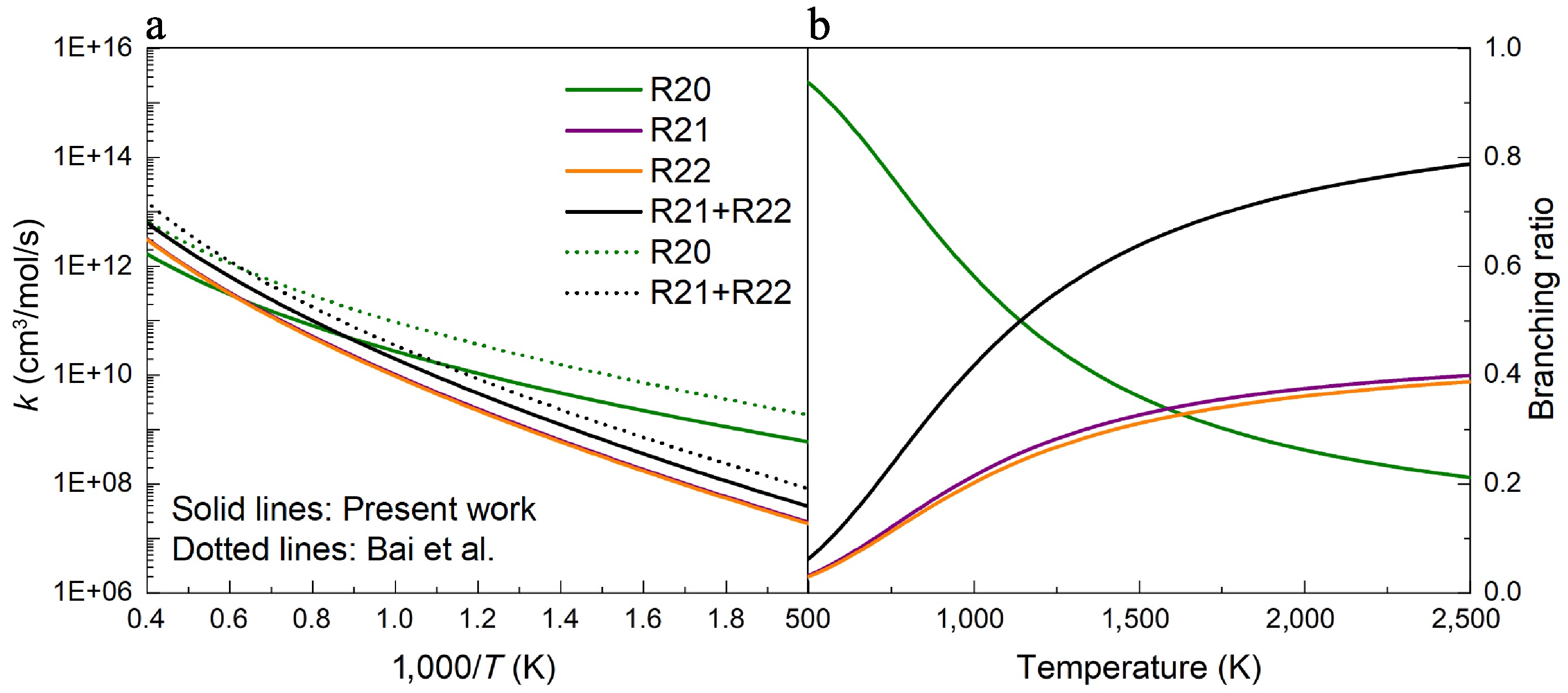 (a) Rate constants, and (b) branching ratios for the H-abstraction reactions of UDMH with H attacking at HPL. Calculated by this work and by Kanno et al.[24] and Bai et al.[25].