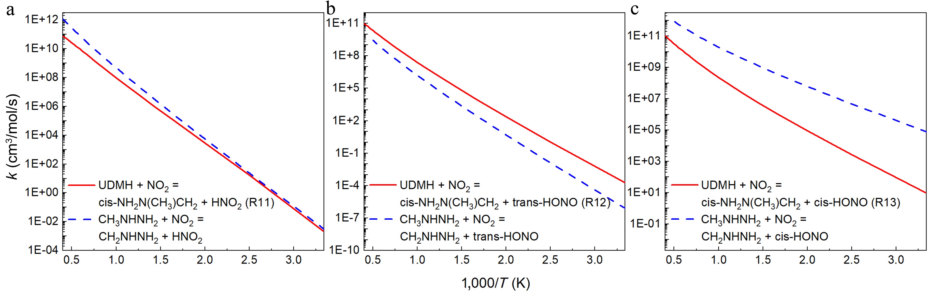 Meanwhile, the rate constants for the H-abstraction reactions of UDMH on different H atom sites (HNH2, Hcis-CH3, and Htrans-CH3), with NO2 attacking at 100 atm were compared (Supplementary Fig. S20). It is obvious that, regardless of whether the attacking atom is the O or N atom in NO2, when the attack occurs at the HNH2 site, the corresponding H-abstraction reactions have much higher rate constants than those at the Hcis-CH3 and Htrans-CH3 sites. As shown in Supplementary Fig. S8, the hindered rotor treatment has less impact on the rate constants for H-abstraction reactions at primary carbon sites with NO2 and H attacking, whereas its effect on H-abstraction reactions at the amine group is relatively evident. For the tunneling treatment, its influence on the H-abstraction reactions with NO2 attacking can be neglected.