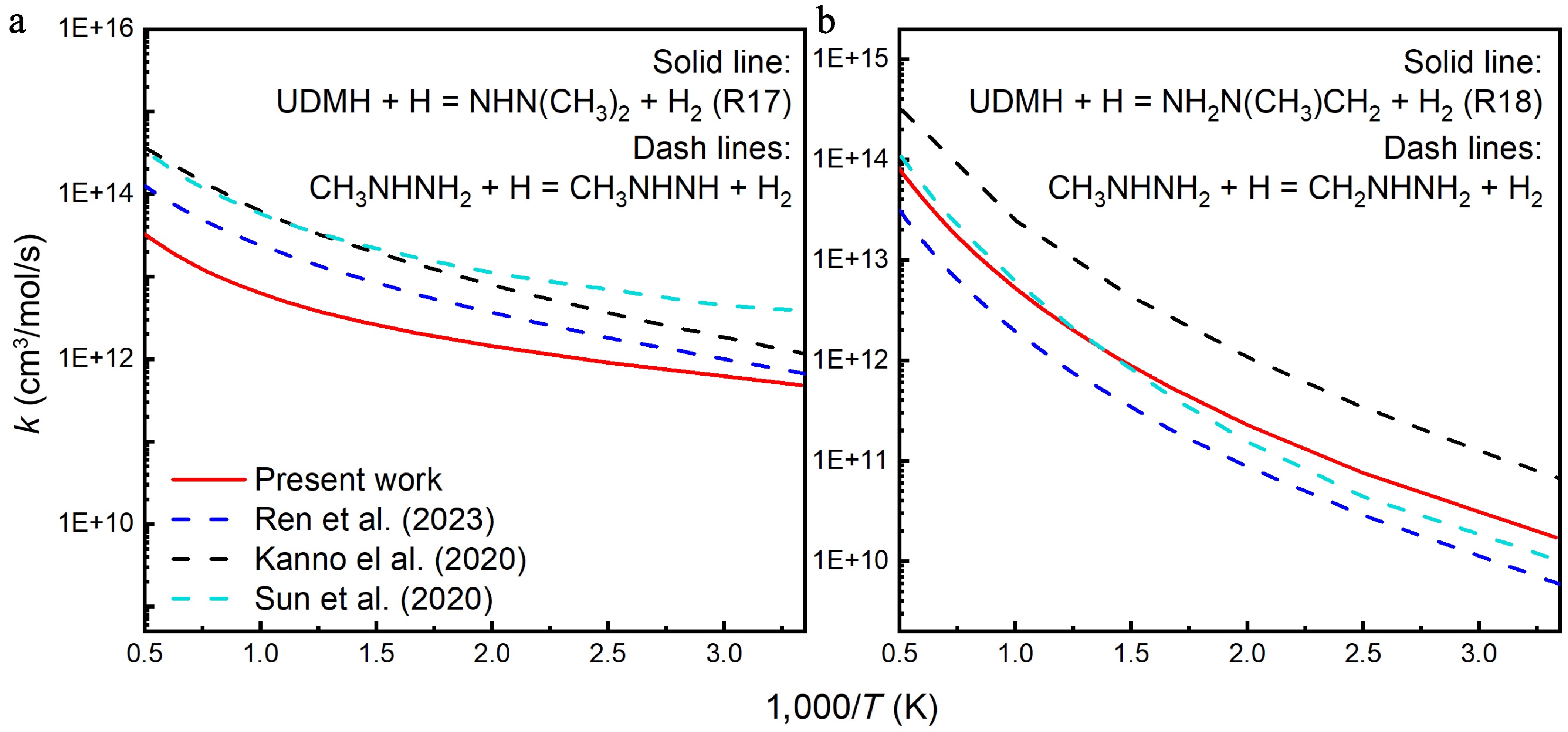 Comparison between the rate constants for (a) UDMH + H = NHN(CH3)2 + H2 (R17), with that for CH3NHNH2 + H = CH3NHNH + H2, and (b) UDMH + H = NH2N(CH3)CH2 + H2 (R18) with that for CH3NHNH2 + H = CH2NHNH2 + H2 calculated by previous reports[17,18,24].
