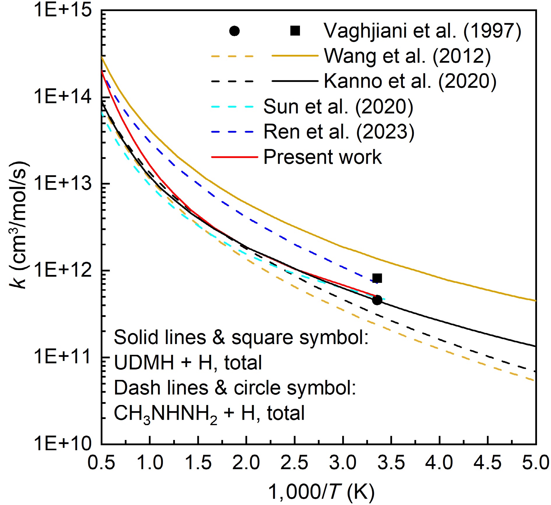 • A comparative analysis was also carried out between the rate constants for the H-abstraction reactions of UDMH with H attacking calculated in this work, and those of CH3NHNH2 with H attacking, in previous reports, as illustrated in Fig. 14. Previous results from Ren et al.[18], Sun et al.[17], and Kanno et al.[24] demonstrated that the rate constants for CH3NHNH2 + H = CH3NHNH + H2, and CH3NHNH2 + H = CH2NHNH2 + H2, exhibited a consistent decreasing trend with temperature. For H abstraction from the amine group (HNH2), the rate constants are lower than those of CH3NHNH2 across the entire temperature range, and exhibit a shallower slope. This may be attributed to the structural differences between UDMH and CH3NHNH2. When H atoms attack the primary carbon sites, the rate constants for the H-abstraction reactions of UDMH are similar in numerical value to that for CH3NHNH2, calculated by Sun et al.[17]. However, notable discrepancies were observed between the calculated results of these three studies. That is, the calculations of Ren et al.[18], and Sun et al.[17] for CH3NHNH2 are lower than those of UDMH, while the results of Kanno et al.[24] are higher.
