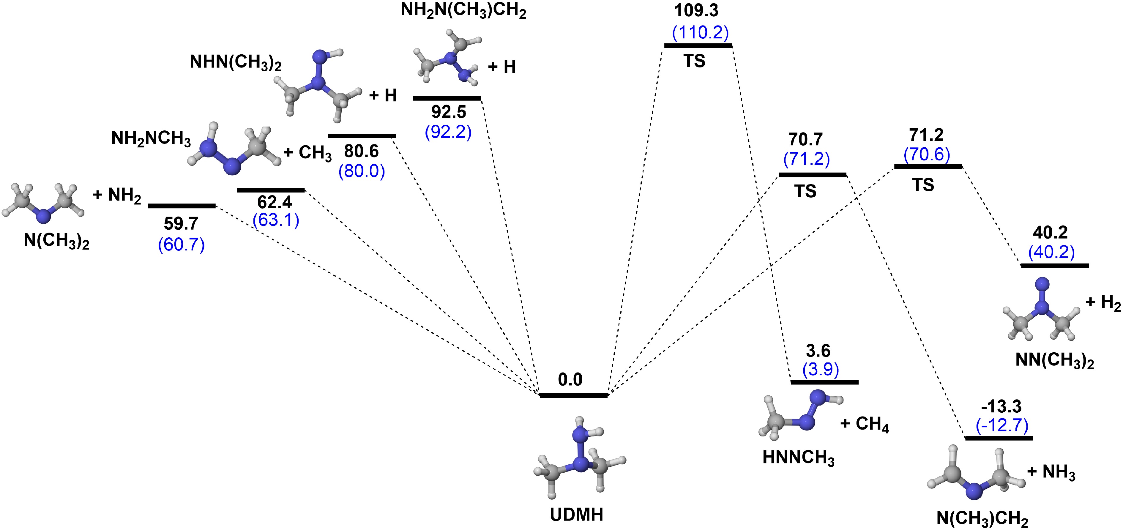 (1) For UDMH, the unimolecular decomposition is dominated by the dissociation reactions on the NH2 and NH3 groups, owing to their relatively low energy barriers among the bond dissociation channels. The elimination reactions make less contribution to UDMH because of their high energy barriers. Furthermore, between these two reactions, the NH2 group dissociation reaction plays the most important role at low- and mid- temperature ranges, while the CH3 group dissociation reaction becomes more significant at higher temperatures.