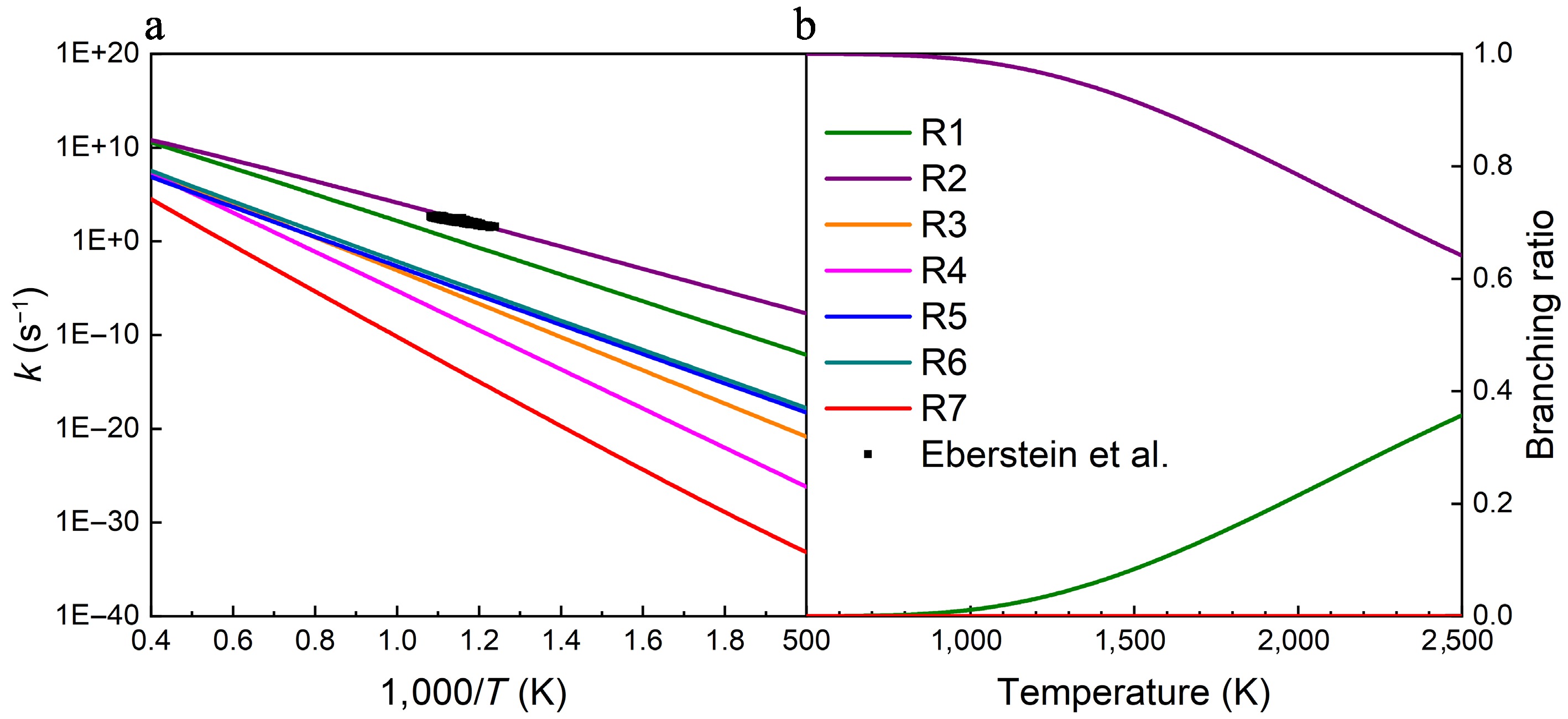 Figure 3 presents the rate constants and branching ratios of seven unimolecular decomposition reactions of UDMH at HPL. It is obvious that the CH3 and NH2 group dissociation reactions (R1 and R2), have relatively higher rate constants than the other reactions. Consequently, UDMH decomposition is dominated by these two reactions, which is in agreement with the PES results. Furthermore, Fig. 3b depicts that the NH2 group dissociation reaction (R2) is dominant, while the contribution of the CH3 group dissociation reaction (R1) increases with temperature and reaches ~40% at 2,500 K. Furthermore, a comparison with the experimental data from Eberstein & Glassman[2], as shown in Fig. 3a, demonstrates excellent convergence with the calculated results. In addition, the rate constants for unimolecular decomposition reactions of UDMH at different pressures were calculated and presented in Supplementary Fig. S16. The rate constants of these seven reactions all exhibit a slight pressure dependence, especially R3, R4, R5, R6, and R7. As depicted in Supplementary Fig. S7, the hindered rotor treatment has less effect on the rate constants of the dominant unimolecular decomposition reactions.