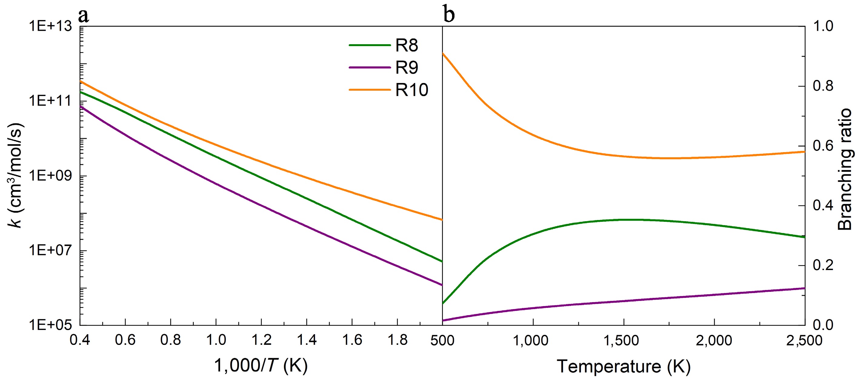 (a) Rate constants, and (b) branching ratios for the H-abstraction reactions of UDMH on the Hcis-CH3 sites, with NO2 attacking at 100 atm.