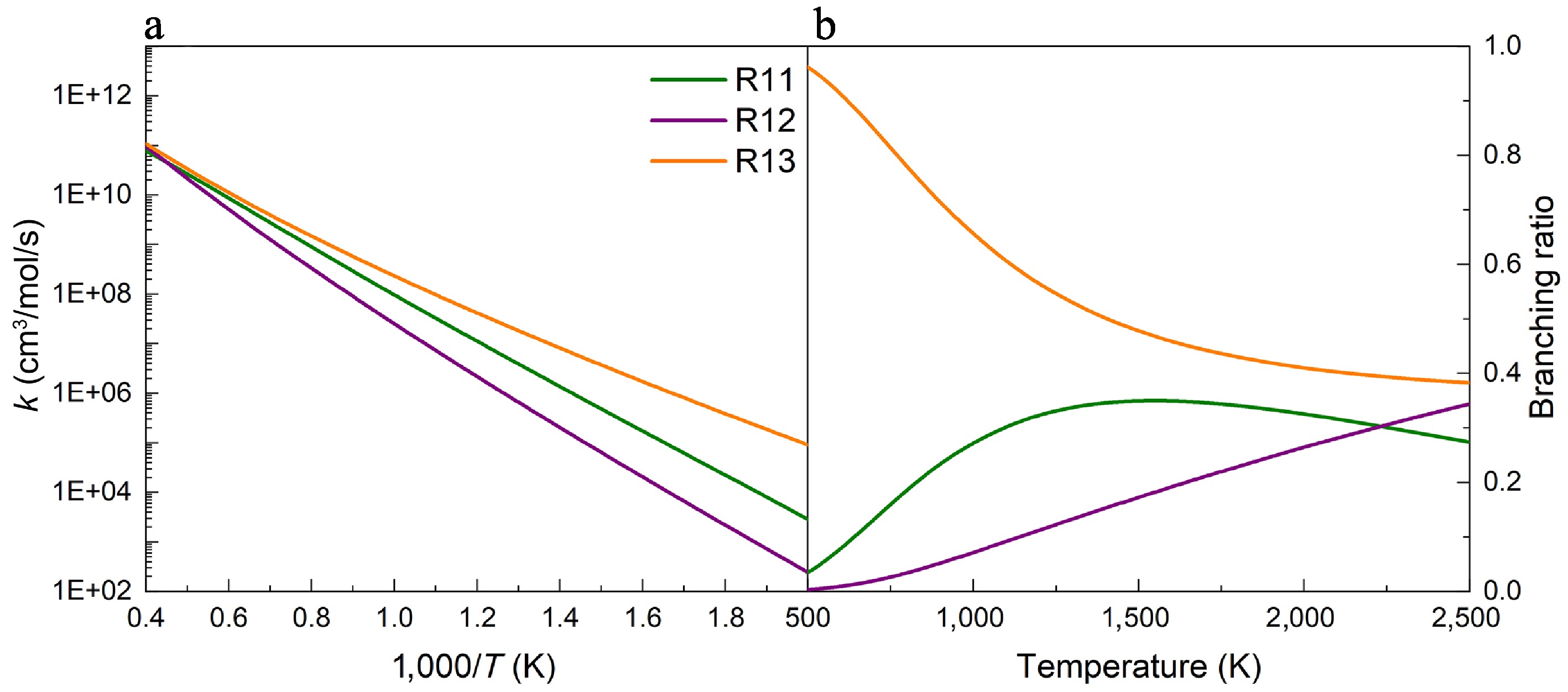 • Apart from the H-abstraction reactions with NO2, the H-abstraction reactions of UDMH involving common species such as H and CH3, were calculated. As shown in Supplementary Fig. S17, there are three types of H atoms: Hinside, Houtside, and Hplane. Hydrogen atoms in different chemical environments are chemically distinct, even within the same group. The calculations reveal that the energy barriers for H-abstraction at the Hinside atom are significantly lower than those at the Houtside, and Hplane atoms (Supplementary Table S4). Consequently, the rate constants for abstractions involving the Hinside atom are higher than those involving the Houtside, and Hplane atoms (Supplementary Fig. S21). In this work, the total rate constants for each site were calculated as k(NH2) = k(Hinside) + k(Houtside), and k(CH3) = k(Hinside) + k(Houtside) + k(Hplane). A comparison of the energy barriers for H-abstraction reactions at Hinside atoms of different groups was performed. Figure 8 demonstrates that the energy barrier of H-abstraction reactions at the amine group is 1.9 kcal/mol, and releases 23.9 kcal/mol of heat to produce HNN(CH3)2, and an H2 product pair. When an H atom attacks the primary carbon sites (Hcis-CH3 and Htrans-CH3), these two H-abstraction reactions exhibit close energy barriers, i.e., 5.2 and 5.4 kcal/mol, which are higher than those of the amine group. The slight PES difference between different primary carbon sites suggests that the molecular conformer effects on H-abstraction reactions with the H atom attacking are negligible. Based on the calculated PES, it should be noted that the energy barrier trend for the H-abstraction reaction by H atoms is consistent with the BDE trends. As illustrated in Fig. 9a, the rate constant of R17 intersects with those of R18 and R19 at about 1,100 K. At low temperatures, the rate constant of R17 exceeds those of R18 and R19, whereas at high temperatures, it falls below them. Meanwhile, the calculations in this work were compared with previous results presented by Kanno et al.[24] and Bai et al.[25]. Both the magnitude and trend of the rate constants for the H-abstraction reactions at the NH2 sites are generally consistent with previous studies. In contrast, our calculated results for the reactions involving the CH3 sites are higher than the previous results. Correspondingly, Fig. 9b depicts that R17 exhibits a higher branching ratio at low temperatures, whereas R18 and R19 dominate at higher temperatures. UDMH prefers H-abstraction reactions to occur at primary carbon sites.