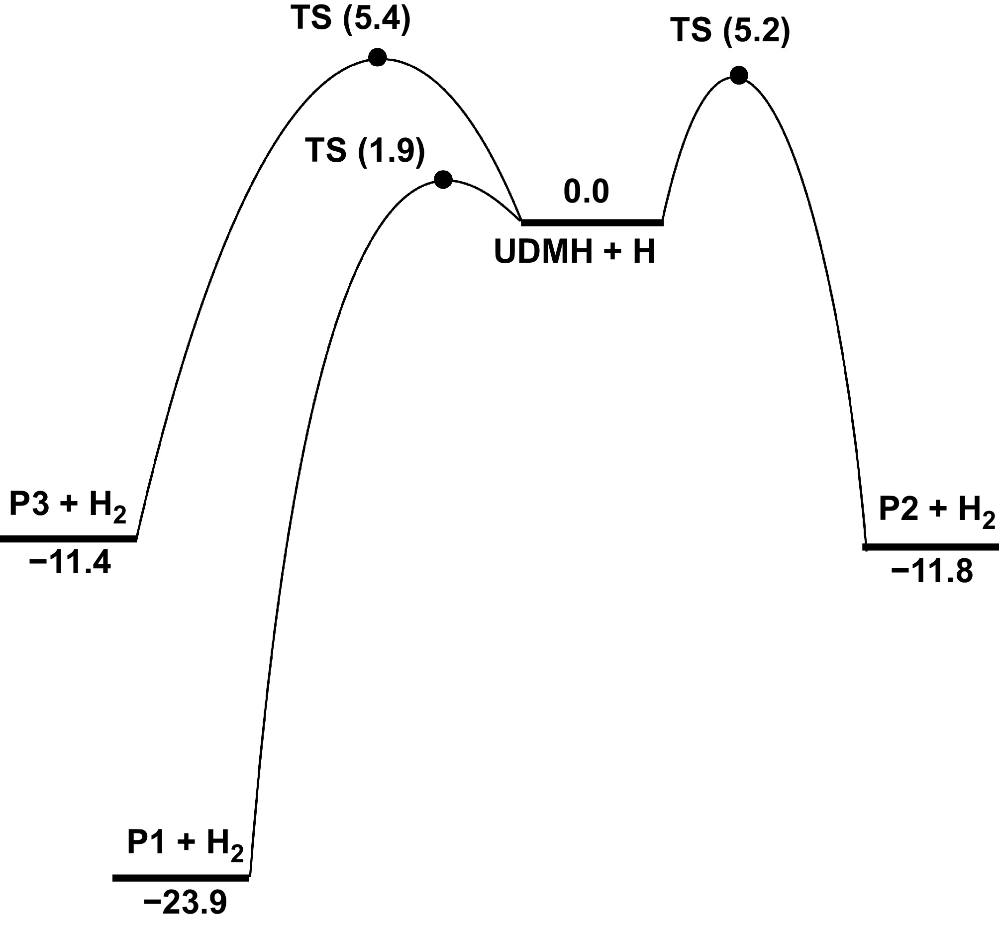 $ {\mathrm{UDMH}}+{\mathrm{H}}={cis\text{-NH}}_{ \mathrm{2}} \mathrm{N(CH}_{ \mathrm{3}} \mathrm{)CH}_{ \mathrm{2}} +{\mathrm{H}}_{ \mathrm{2}} $ (R18)