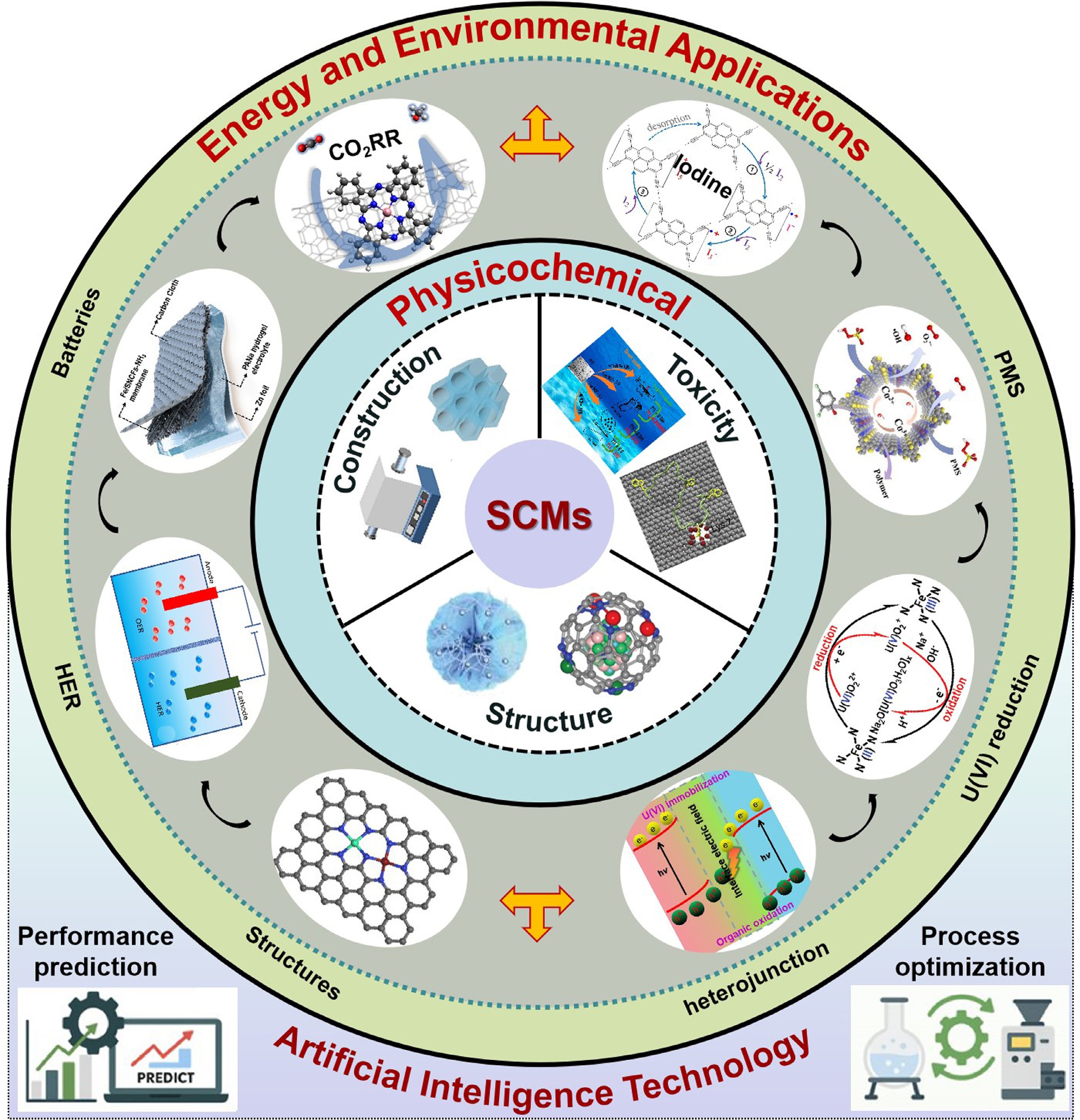 In this context, SCMs hold immense promise for addressing the pressing challenges in the energy and environmental fields. Their unique properties, coupled with the potential of AI technologies, make them key players in the pursuit of sustainable development. As shown in Fig. 1, this work aims to provide a comprehensive overview of the construction, toxicity, and detection, as well as the structure and application of SCMs in environmental pollution control and energy conversion, and it also explores the role of AI in advancing the field of SCMs, highlighting the current state of research, challenges, and future perspectives. By delving into these aspects, it is believed that this review seeks to contribute to the ongoing efforts towards the development and implementation of SCMs for a greener and more sustainable future.