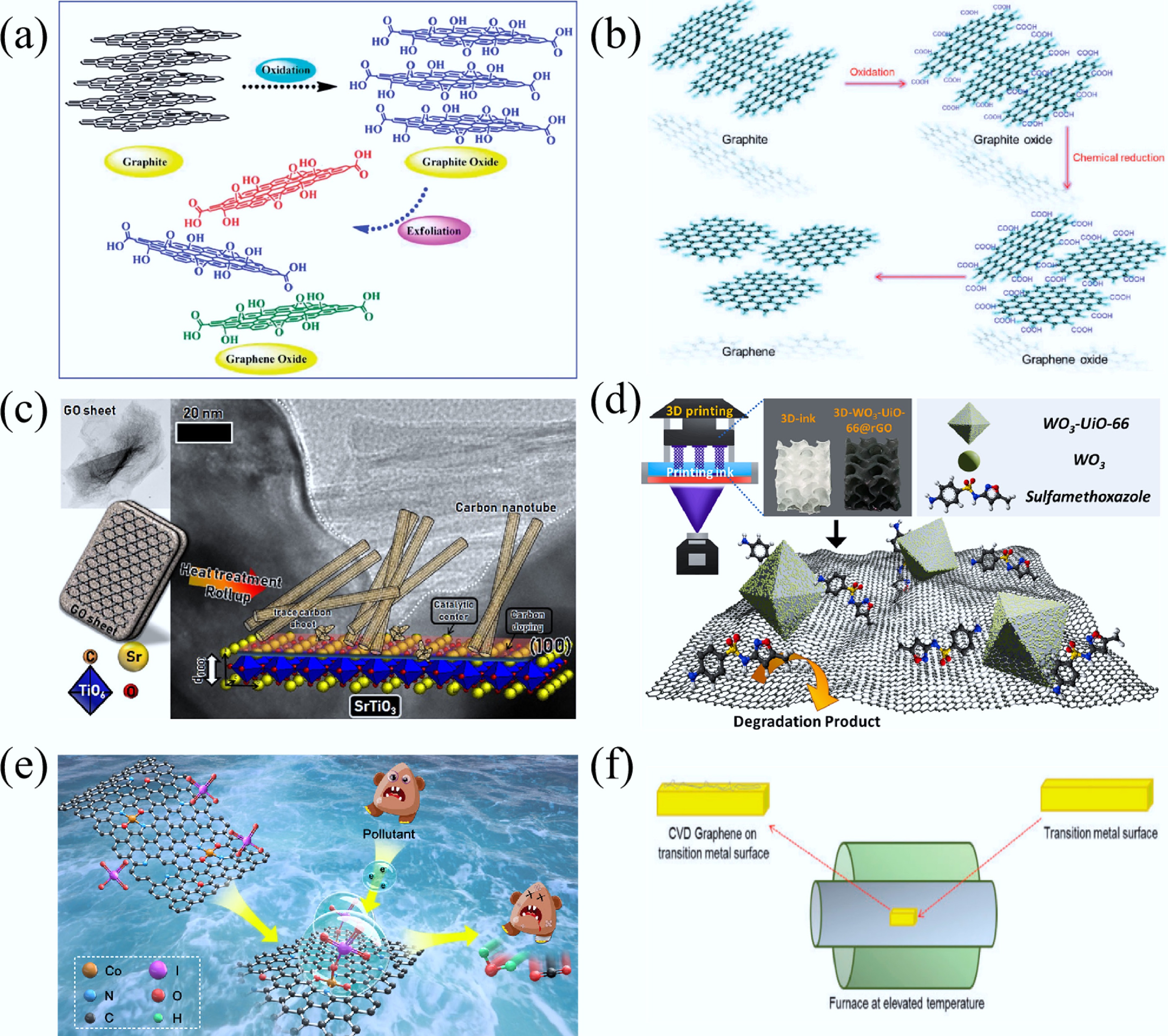 Graphene prepared by the three exfoliation methods shows different structural and performance features. Mechanically exfoliated graphene has fewer pores, excellent conductivity (retaining its pristine sp2 structure), and superior optical properties from layer-dependent absorption, but lacks surface functionality. Chemically exfoliated graphene forms pores via sheet restacking, experiences significant conductivity loss due to oxidative defects, exhibits tunable optical transitions, and contains abundant surface O groups. In contrast, electrochemically exfoliated graphene exhibits moderate conductivity and porosity, fewer surface O groups, and retains decent optical absorption. For environmental remediation, chemical exfoliation outstrips mechanical exfoliation (inert surfaces) owing to rich O groups and porosity, while electrochemical exfoliation balances adsorption capacity and stability. For catalysis, mechanically exfoliated graphene with pristine basal planes excels in HER, while chemically/electrochemically exfoliated graphene, with defect-mediated activity, performs better in CO2RR/ORR/OER. Owing to aqueous processing, moderate yield, low chemical usage, and energy efficiency, electrochemical exfoliation outperforms the other two in scalability and sustainability. Overall, while superior to carbonization/templating in targeted graphene synthesis, these methods face inherent efficiency-performance tradeoffs.