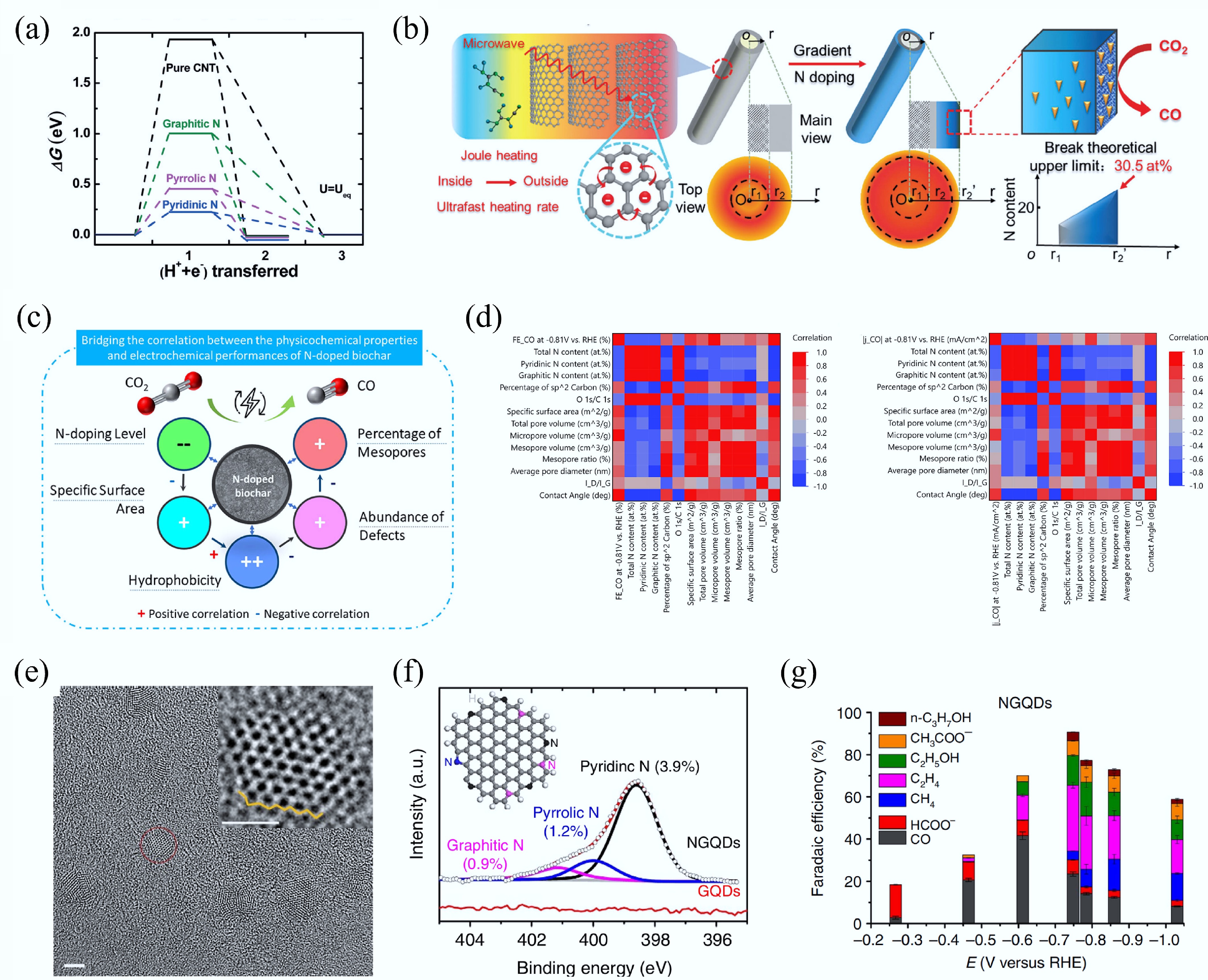 In the energy sector, AI techniques, particularly GNNs, have shown strong potential in the design and development of carbon-based catalysts and energy storage materials. Wu & Li reviewed the use of ML in predicting the electrochemical performance of SACs, emphasizing its role in activity screening and mechanistic analysis for key reactions such as CO2RR, HER, and OER[726]. Li et al. combined RF algorithms with DFT calculations to investigate the electrochemical properties of 104 graphene-supported SACs across ORR, OER, and HER pathways[373]. Their model effectively identified the importance of various descriptors and accelerated the screening of promising catalyst candidates, thereby supporting the design of high-performance carbon-based electrocatalysts. This approach employed DFT simulations to calculate the structures and limiting potentials of graphene-supported M@NxCy SACs, and ML models (mean square errors of 0.027/0.021/0.035 V for ORR/OER/HER, respectively) to predict catalytic activity. The study confirmed the reliability of the ML models and identified top-performing SACs, such as Ir@pyridine-N3C1 and Ir@pyridine-N2C2, that outperform conventional noble-metal oxides. These results demonstrate how AI can significantly accelerate catalyst screening and performance evaluation, thereby providing robust support for carbon-based catalyst design and development in energy applications (Fig. 38b, c). Additionally, Wan et al. employed a gradient boosting regression algorithm integrated with DFT-based screening to predict the CO2RR activity of phthalocyanine-based dual-atom catalysts (Fig. 38d, e), achieving an R2 score of 0.96 and identifying promising materials with low limiting potentials[727]. Furthermore, Zafari et al. utilized ML models integrated with DFT calculations to systematically evaluate the NRR selectivity and HER competition of various catalysts[728]. They visualized the relationship between the limiting potentials of NRR and HER (Fig. 38f), highlighting the performance distribution and revealing promising catalyst candidates with high selectivity and activity.