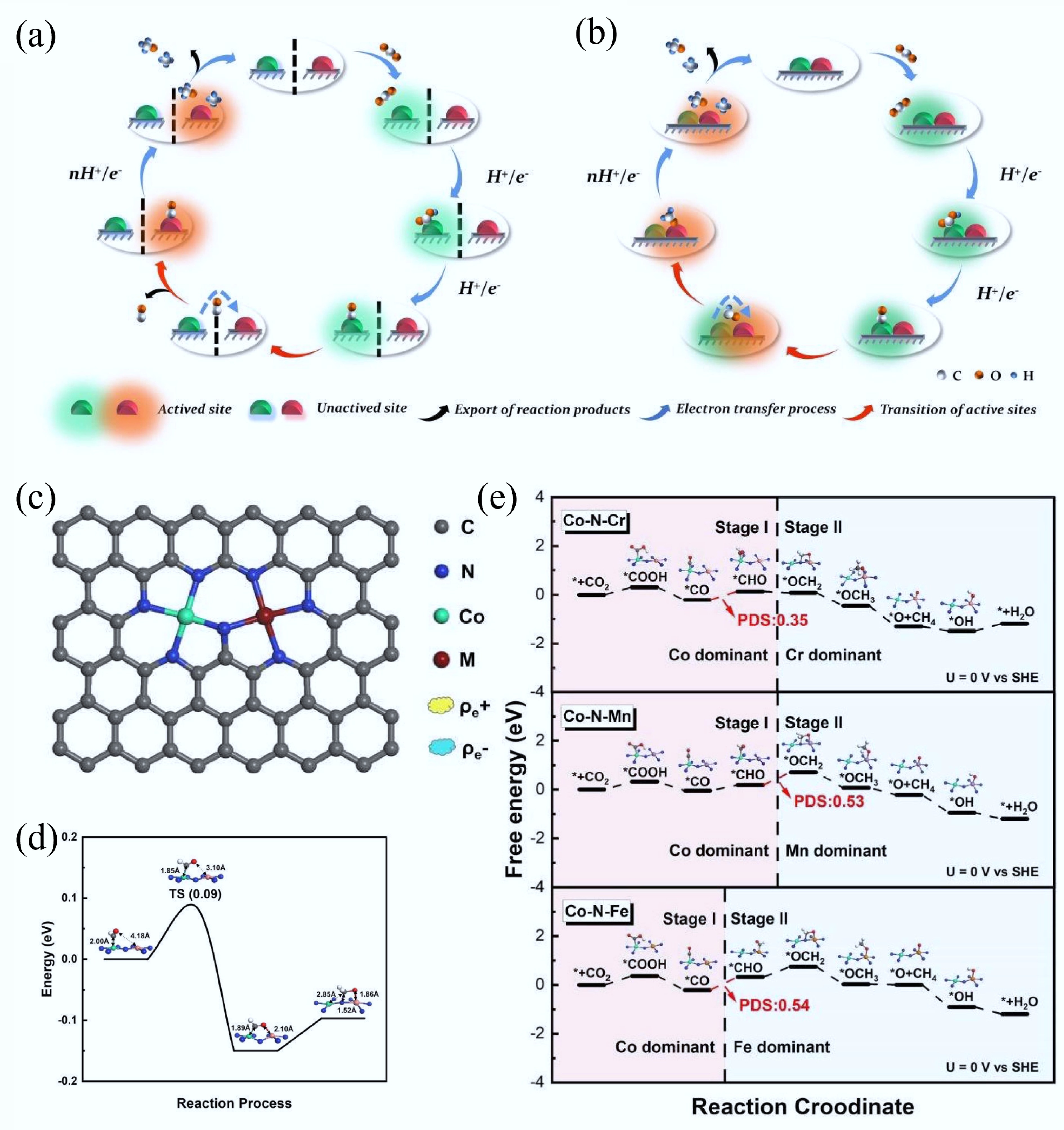 Beyond functional group modification, the introduction of single-atom catalysts (SACs) presents unprecedented opportunities to boost the catalytic activity of CMs, thus enabling their breakthroughs in energy conversion and environmental governance. Balamurugan et al. reported a bifunctional catalyst featuring single Mo electroactive sites[33]. The catalyst comprised nanoscale (~2.3 ± 0.6 nm) vanadium molybdenum oxynitride cores encapsulated by N-doped carbon shells (Fig. 5b). During pyrolysis, single Mo atoms were released from the core and anchored to electronegative N-dopant species in the graphitic carbon shell. The resulting Mo SACs excelled as active OER sites in pyrrolic-N and as active ORR sites in pyridinic-N environments. Owing to the coexistence of both pyrrolic-N and pyridinic-N dopants in the graphene shell, these Mo SACs exhibited the lowest overpotential, the lowest Tafel slope, and the smallest potential difference in comparison with other catalysts, demonstrating their superior bifunctional (OER and ORR) responses (Fig. 5c–e). Likewise, Poudel et al. designed a unique nanostructure via the coupling of Co single-atoms and Ni NPs on a pyri-N- enriched carbon network substrate[76]. According to DFT calculations, the atomic dispersion of Co single-atoms enables optimal exposure of active sites on the pyri-N dominated multidimensional carbon skeleton, while the synergistic effects with Ni NPs substantially suppress electron delocalization near metallic centers, which promotes the adsorption of oxygen intermediates, thus giving rise to a lower charge transfer barrier. Within this system, this hybrid catalyst presents superior OER/ORR activity.
