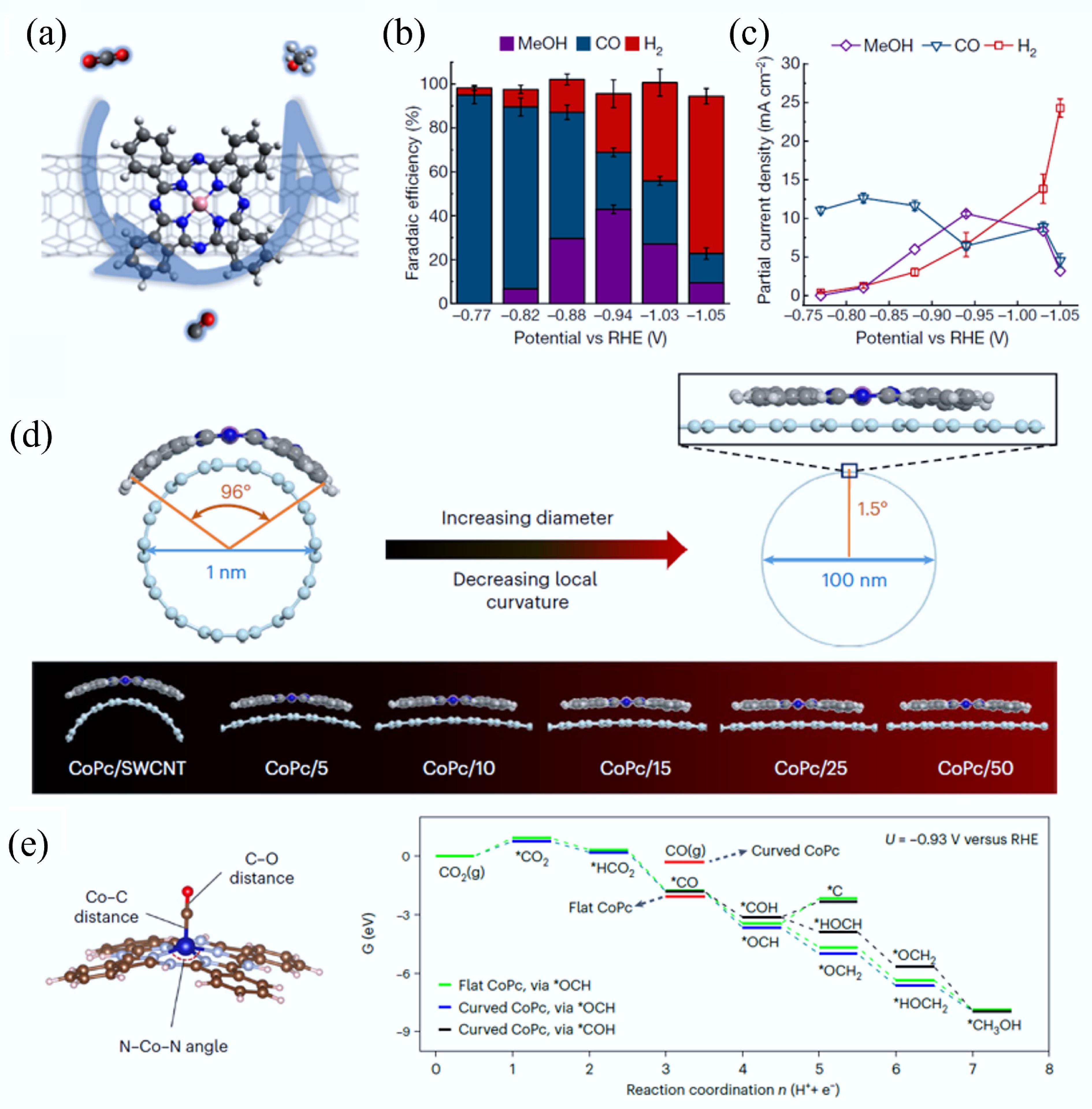Unlike templated or etched CMs that have high-porosity CMs (SSA > 1,000 m2/g), the CVD CMs typically have non-porous, dense structures (e.g., graphene, CNTs) with relatively low SSA (< 500 m2/g). Notably, CVD CMs exhibit exceptional conductivity (> 104 S/m) due to high crystallinity, outperforming carbonized or templated CMs. Meanwhile, CVD CMs, with tunable band gaps (e.g., graphene quantum dots) and high transparency (e.g., atomically thin CVD graphene), are ideal for optoelectronic applications. Different from etched or templated CMs, which are featured with abundant defects and edge sites, the CVD CMs have smooth, pristine conductive surfaces with few active sites, which is beneficial for their regeneration when used as electrode materials. The high conductivity of CVD CMs makes them perfect candidates for HER. Engineered defects or heteroatom doping can effectively enhance their CO2RR/ORR/OER catalytic activity. However, the CVD method requires high temperatures (500–1,500 °C), metal catalysts, and toxic precursors (e.g., methane), restricting its scalability and sustainability.