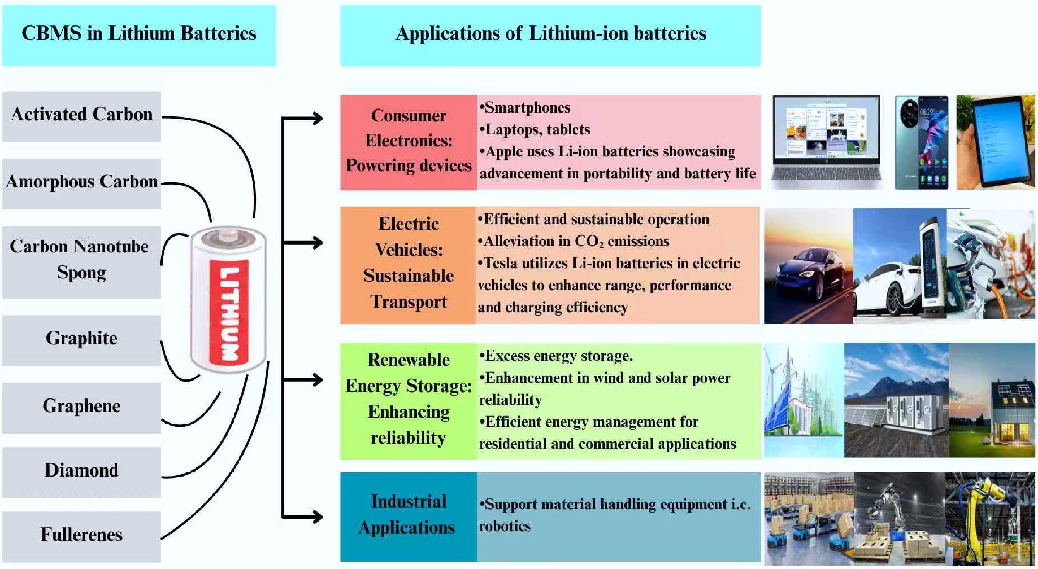 Furthermore, Aurbach et al. discovered the effect of conductive agents, i.e., carbon black, mainly MWCNTs, and carbon cellulose, on three different LIBs, adding LiCoO2[612]. The examination revealed that LiCoO2/MWCNT LIBs exhibited the maximum conductivity at a rate of 2C because of the highly conductive nature of MWCNTs and the promotion of electron transfer to the electrode by CNTs, thus building a conductive network with no loss. Whereas the other two composites, i.e., LiCoO2/CF-LIBs and LiCoO2/carbon black-LIBS, showed 30% and 10% capacity losses after two-week cycling, respectively. This discovery provided the fact that composite conductive agents hold better conductivity in comparison to single conductive agents[539,613]. Collectively, it is concluded that CMs are commonly used in LIBs, as presented in Fig. 35.