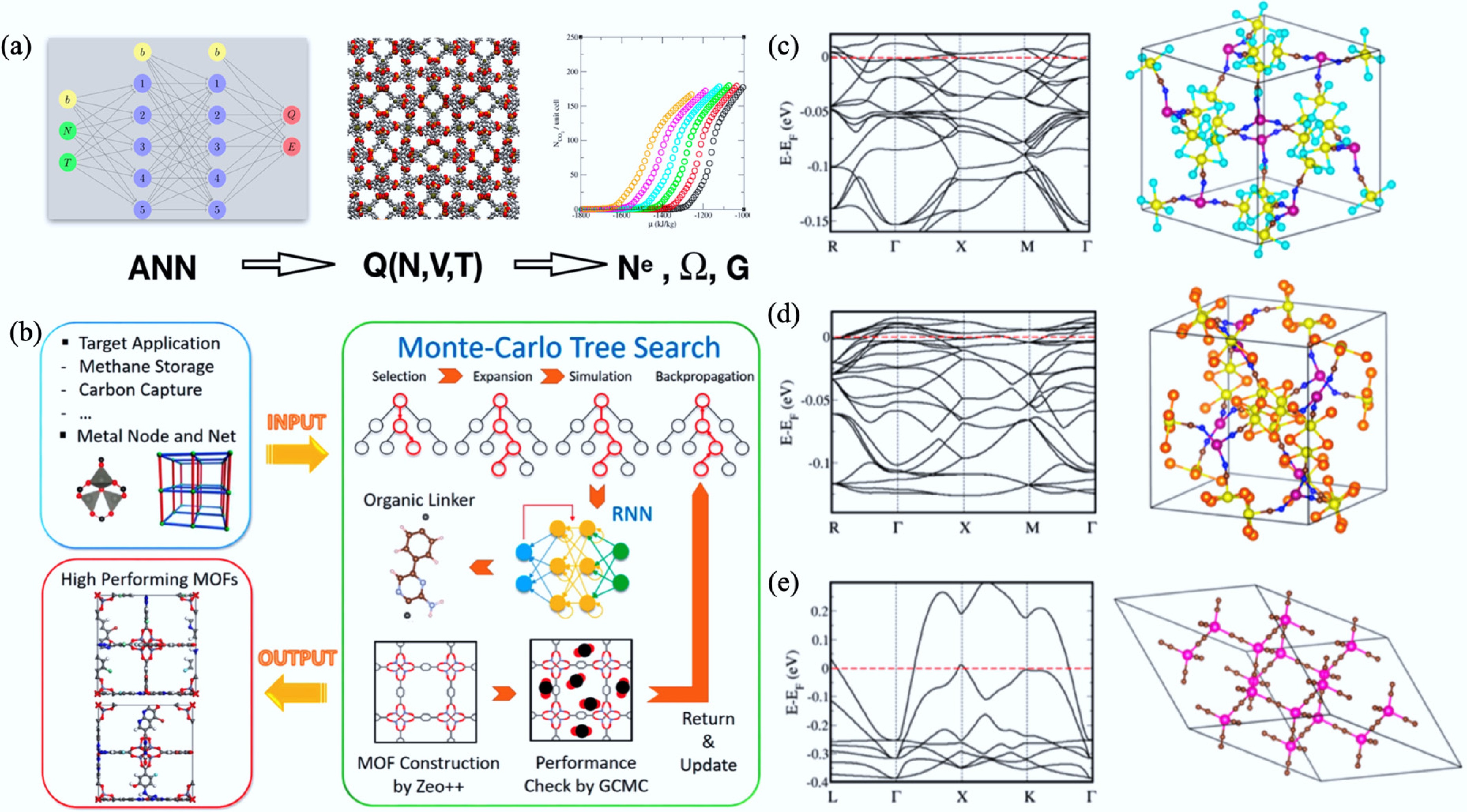 (a) Schematic illustration of an ensemble learning framework integrating ANNs to predict the partition functions of adsorbed fluids in metal–organic and COFs[715]. (b) Representation of the Monte Carlo tree search and recurrent RNN framework for the inverse design of application-specific MOFs[713]. (c)–(e) Optimized crystal structures and calculated electronic band structures of three DFT-confirmed metallic MOFs—Mn9Re24C24S32N24, Mn9Re24C24Te32N24, and Mn9Re24C24Se32N24—highlighting their zero band gaps and potential electrical conductivity[711].