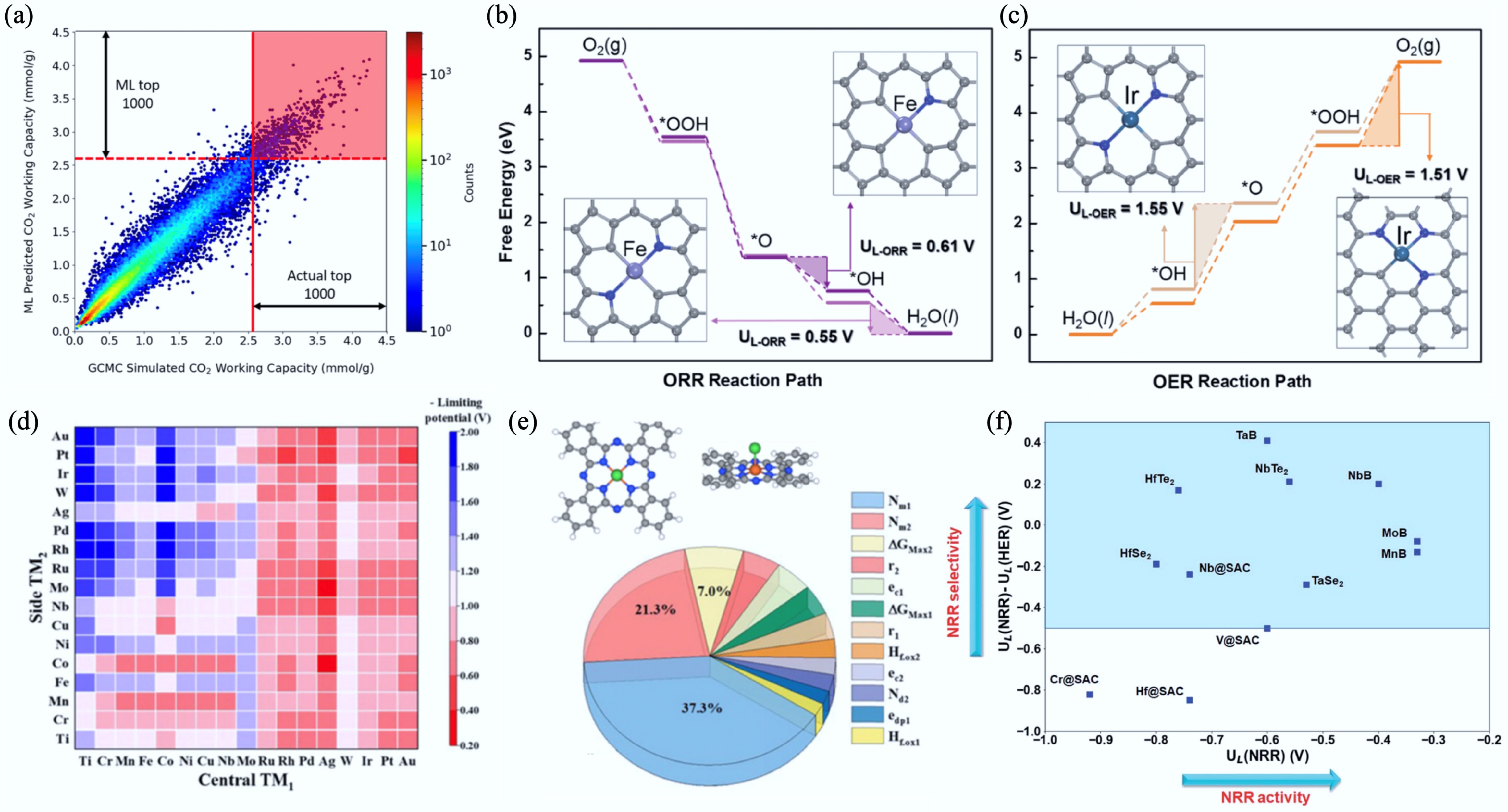 (a) Heat map showing the correlation between ML-predicted CO2 working capacity and Grand Canonical Monte Carlo-simulated CO2 working capacity for MOFs[724]. (b) Heat map of ML-predicted theoretical limiting potentials for Pc DACs; the redder, the better the catalytic activity for the CO2RR. (c) Feature importance analysis highlighting the top 12 descriptors (contribution 41.5%)[726]. (d), (e) Free-energy diagrams and geometries of prominent M@NₓCᵧ SACs for the ORR and OER, at zero electrode potential. The rate-determining steps are highlighted by shades, and the blue and gray balls represent nitrogen and carbon atoms, respectively[727]. (f) Visual comparison of limiting potentials for the NRR and the HER for various SACs and related materials[728].
