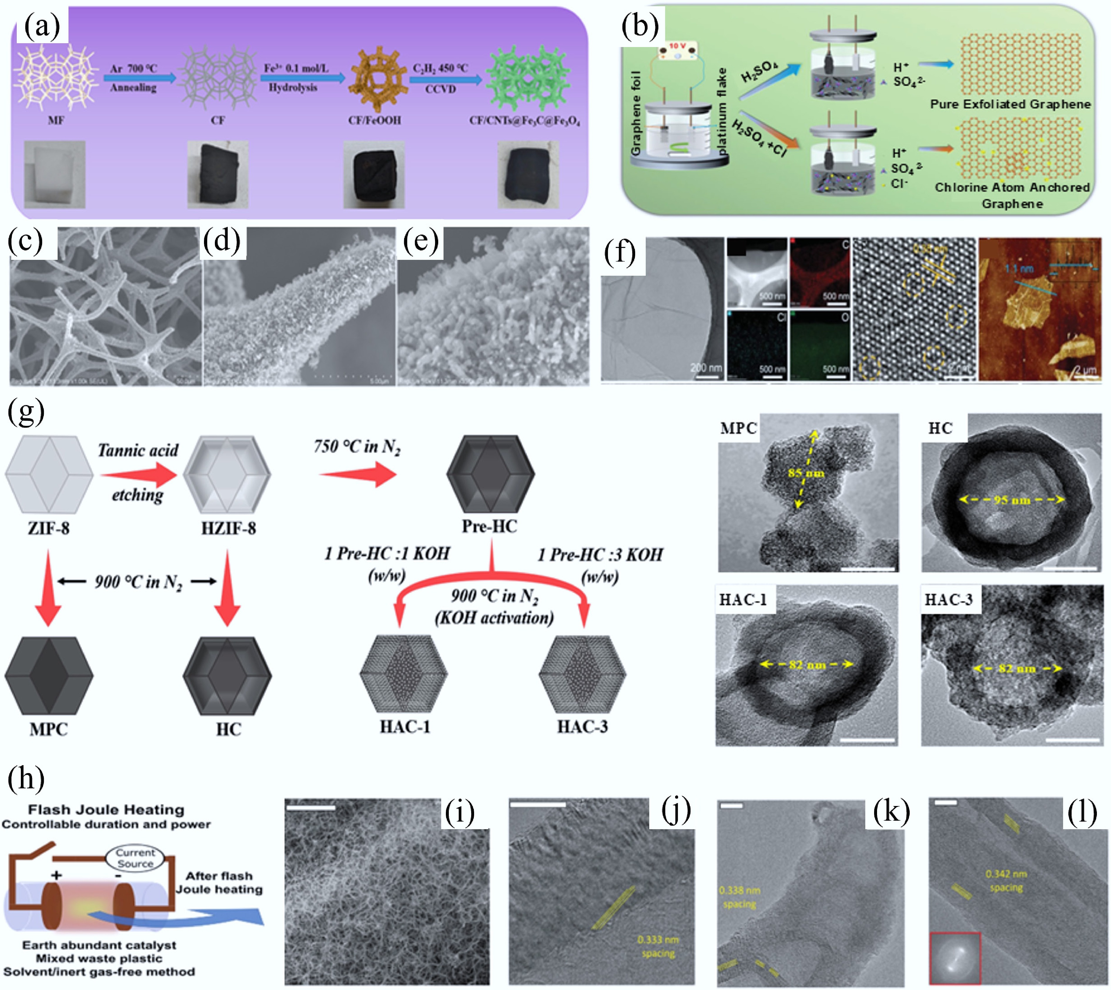 (a) Synthesis of CF/CNTs@Fe3C@Fe3O4 via in-situ growth of CNTs via catalytic CVD of C2H2 at 450 °C. (b)–(d) SEM images of CF/CNTs@Fe3C@Fe3O4 with different magnifications[57]. (e) Preparation process of chlorine-doped graphene (working electrode: graphite flake; counter electrode: platinum foil; electrolyte: sulfuric acid with chloride salt; applied potential: +10 V) and (f) morphology and structure characterizations[62]. (g) Synthetic pathways and corresponding morphologies of MPC (microporous carbon from ZIF-8 carbonization), HC (hollow carbon from tannic acid-etched ZIF-8 carbonization), HAC-1 and HAC-3 (hollow AC from HC activated with KOH/pre-HC weight ratios of 1 and 3, respectively, at 900 °C in N2)[63]. (h) Preparation of flash 1D materials via FJH using waste polymer as starting material (~3,000 K temperatures generated in 0.05–3 s) and (i)−(l) different morphologies of flash 1D materials[64].