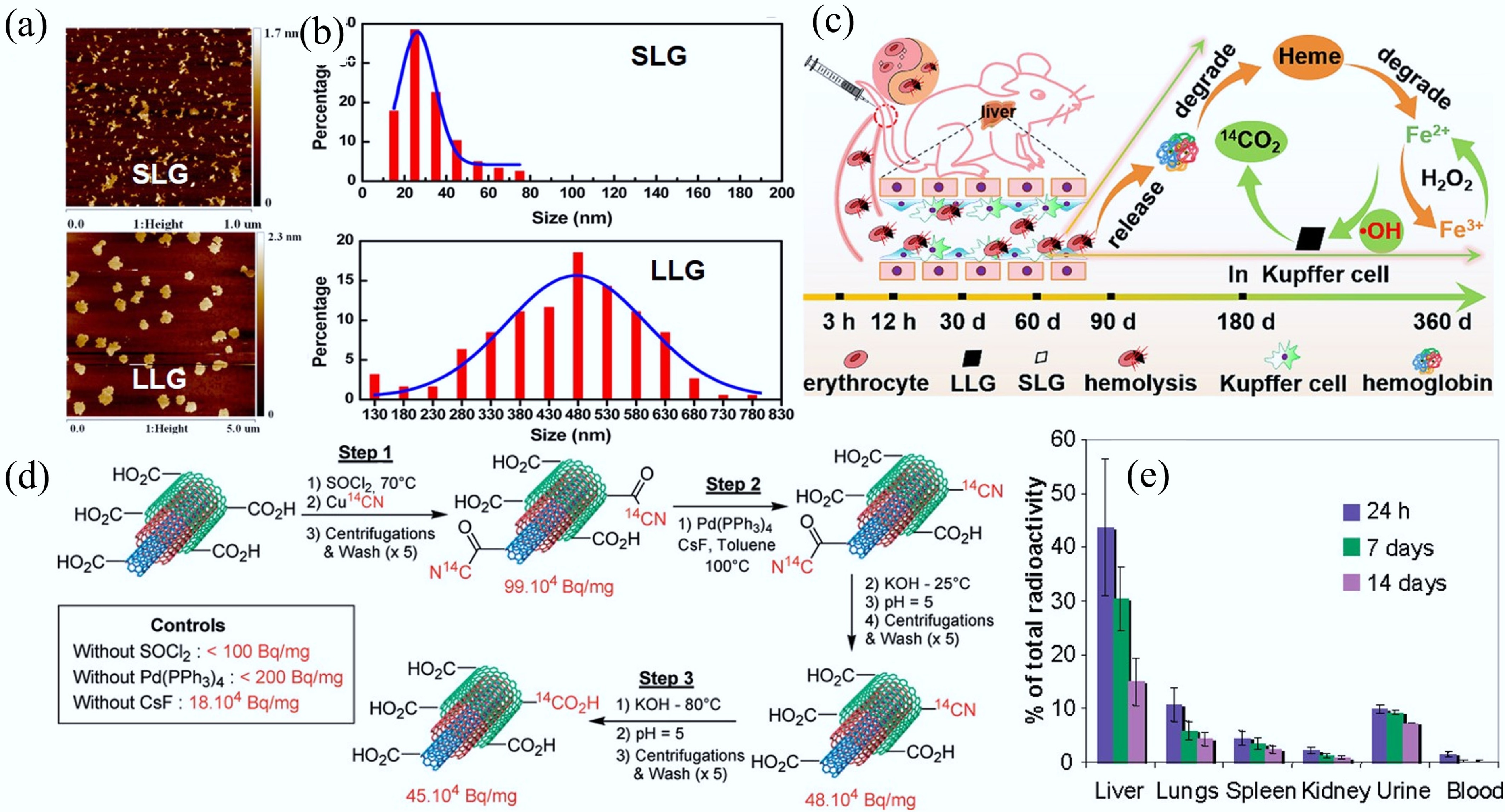 (a) Representative atomic force microscope topography of SLG and LLG. (b) Histogram of SLG and LLG size distribution. (c) Schematic illustration of the process of LLG triggering the Fenton reaction in Kupffer cells[85]. (d) Preparation process of 14C-labelled multi-walled CNTs. (e) Biodistribution of intravenously administered 14C-labeled multi-walled CNTs at different time points after exposure. Each group contained six animals (n = 6)[88].
