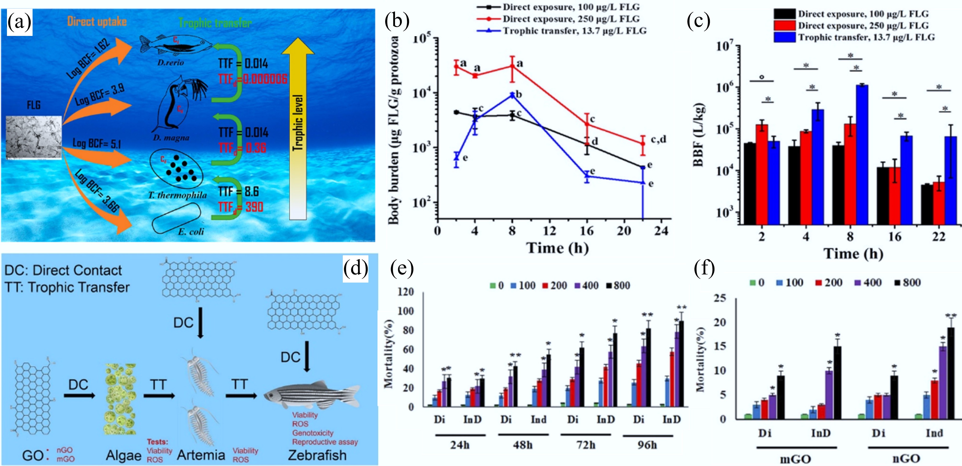 (a) Schematic diagram of the bioaccumulation of 14C-labeled few-layer graphene (FLG) in an aquatic food chain through direct uptake or trophic transfer. (b) Body burden of T. thermophile during the direct exposure to FLG with concentration of 100 or 250 μg/L and trophic transfer from FLG associated E. coli. Each data point represents the mean of three independent replicates, with error bars showing the standard deviation (SD). Statistical significance is determined using Tukey's multiple comparison test. Groups labeled with the same letter do not differ significantly (p ≥ 0.05). (c) BBFs of FLG at different time points during T. thermophila growth in the presence of FLG, administered either directly in the medium (direct exposure) or with FLG-encrusted E. coli (trophic transfer). Bars represent BBFs derived from the mean values of FLG measured in triplicate. Asterisks (*) denote statistically significant differences[31]. (d) Schematic diagram of direct contact and trophic transfer of GO nanosheets in an aquatic food chain. (e) Mortality of Artemia salina caused by Nano-GO. (f) Mortality of D. rerio caused by Micro-GO and Nano-GO (in the Figures, direct ingestion and trophic transfer pathways are denoted as Di and InD, respectively). In (e) and (f), statistical significance is indicated by (*) and (**), corresponding to p ≤ 0.05 and p ≤ 0.01, respectively. All experiments were conducted in triplicate[106].