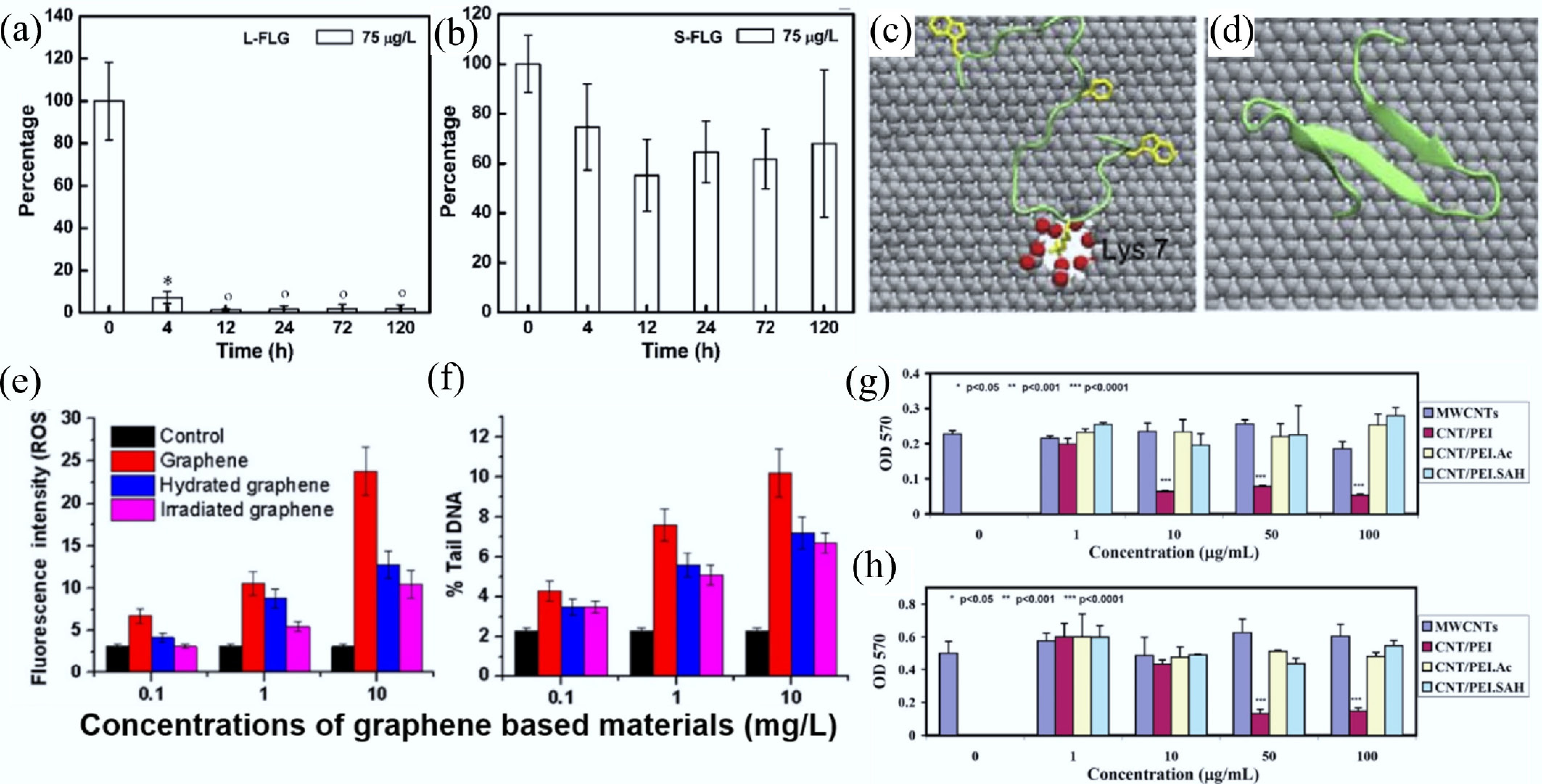 Depuration of (a) Larger few-layer graphene and (b) Smaller few-layer graphene in zebrafish. Data are presented as mean ± SD (n = 5). Statistical significance was determined by Tukey's test (p < 0.05). Symbols (°) and (*) indicate values not significantly or significantly different from zero, respectively[90]. Representative contact configuration of YAP65WW protein adsorption onto (c) defective graphene and (d) ideal graphene surfaces (carbon, silver; oxygen, red; hydrogen, white). The critical residue Lys-7 involved in the binding process is labeled[114]. Effects of hydration and visible-light irradiation on the reduction of (e) oxidative stress and (f) DNA damage induced by pristine graphene. All experiments were conducted in triplicate, and error bars represent mean ± SD[101]. MTT assay results of cell viability for (g) FRO (a human thyroid cancer cell line) and (h) KB (a human epithelial carcinoma cell line) after 24 h treatment with differently functionalized MWCNTs. Each treatment was performed in triplicate, and error bars represent mean ± SD. Statistical significance was determined using the ANOVA test and is indicated by (*), (**), and (***) for p < 0.05, p < 0.001, and p < 0.0001, respectively[123].