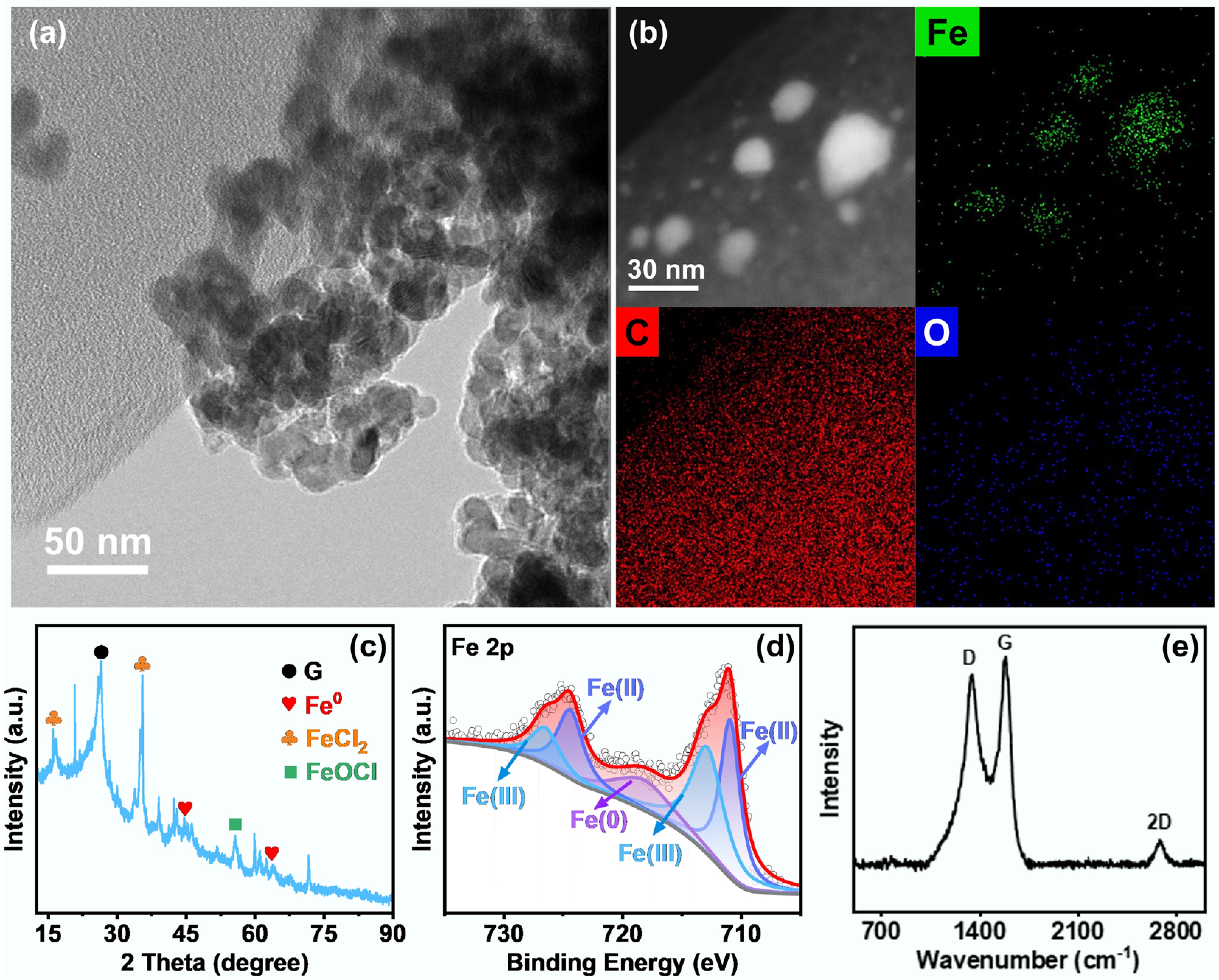 (a) Transmission electron microscope (TEM) images, (b) high-angle annular dark-field (HAADF) images, and the corresponding EDS-mapping images of Fe/C-250V composite catalyst. (c) X-ray diffraction spectra, (d) Fe 2p X-ray photoelectron spectroscopy spectra, and (e) Raman spectra of the Fe/C-250V composite catalyst.