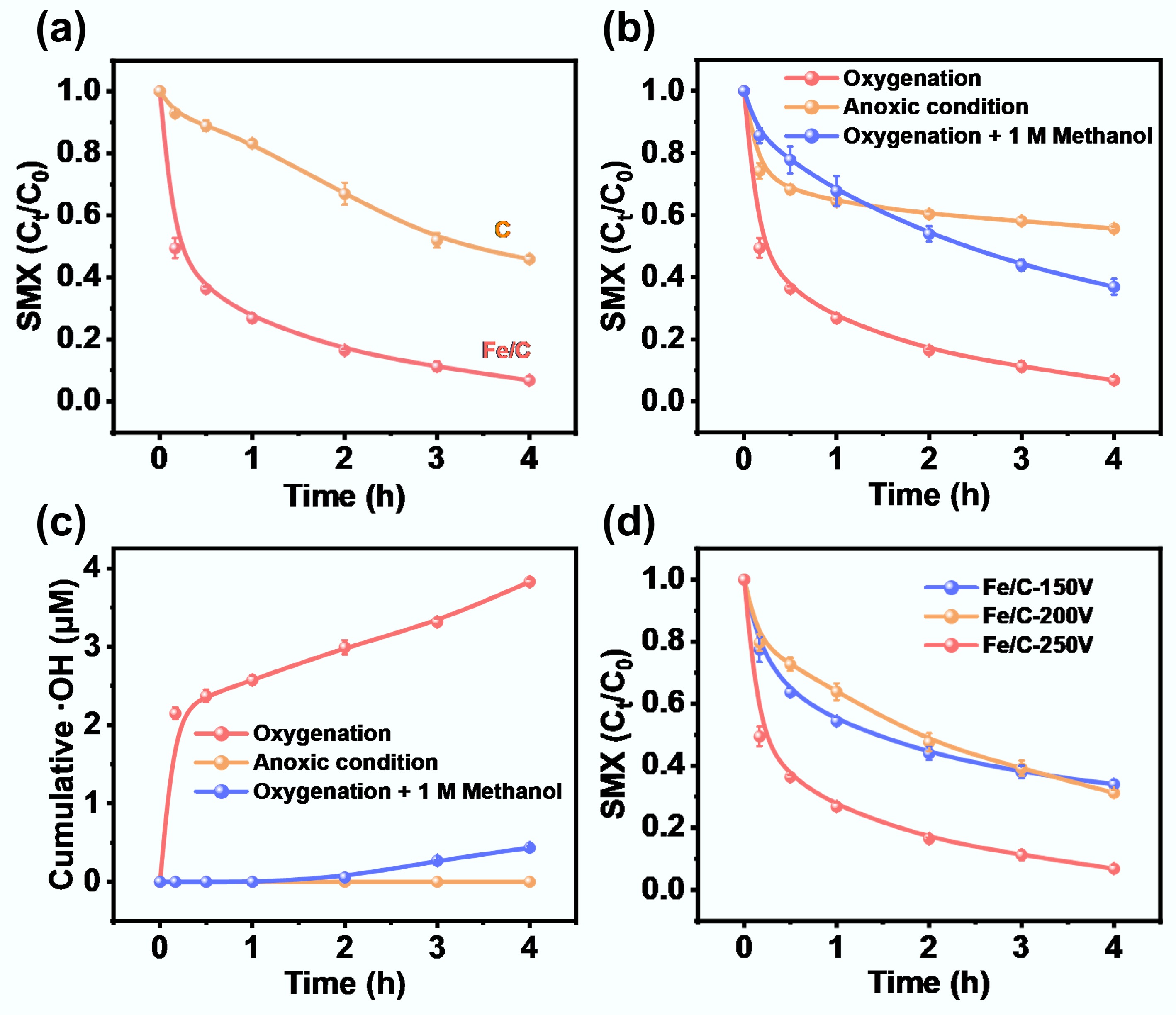 (a) Sulfamethoxazole (SMX) removal performance of Fe/C-250V composite catalyst and carbon substrate (Note: carbon substrate represents individual biochar treated by C-FJH at 250 V). (b) SMX removal performance and (c) cumulative concentrations of hydroxyl radicals (•OH) in various systems with Fe/C-250V composite catalyst. (d) SMX removal performance of Fe/C catalysts fabricated by FJH treatment with different initial voltage. (Reaction conditions: SMX = 10 mg/L, Fe/C catalysts or carbon substrate = 1.0 g/L, pH = 7, temperature = 298 K).