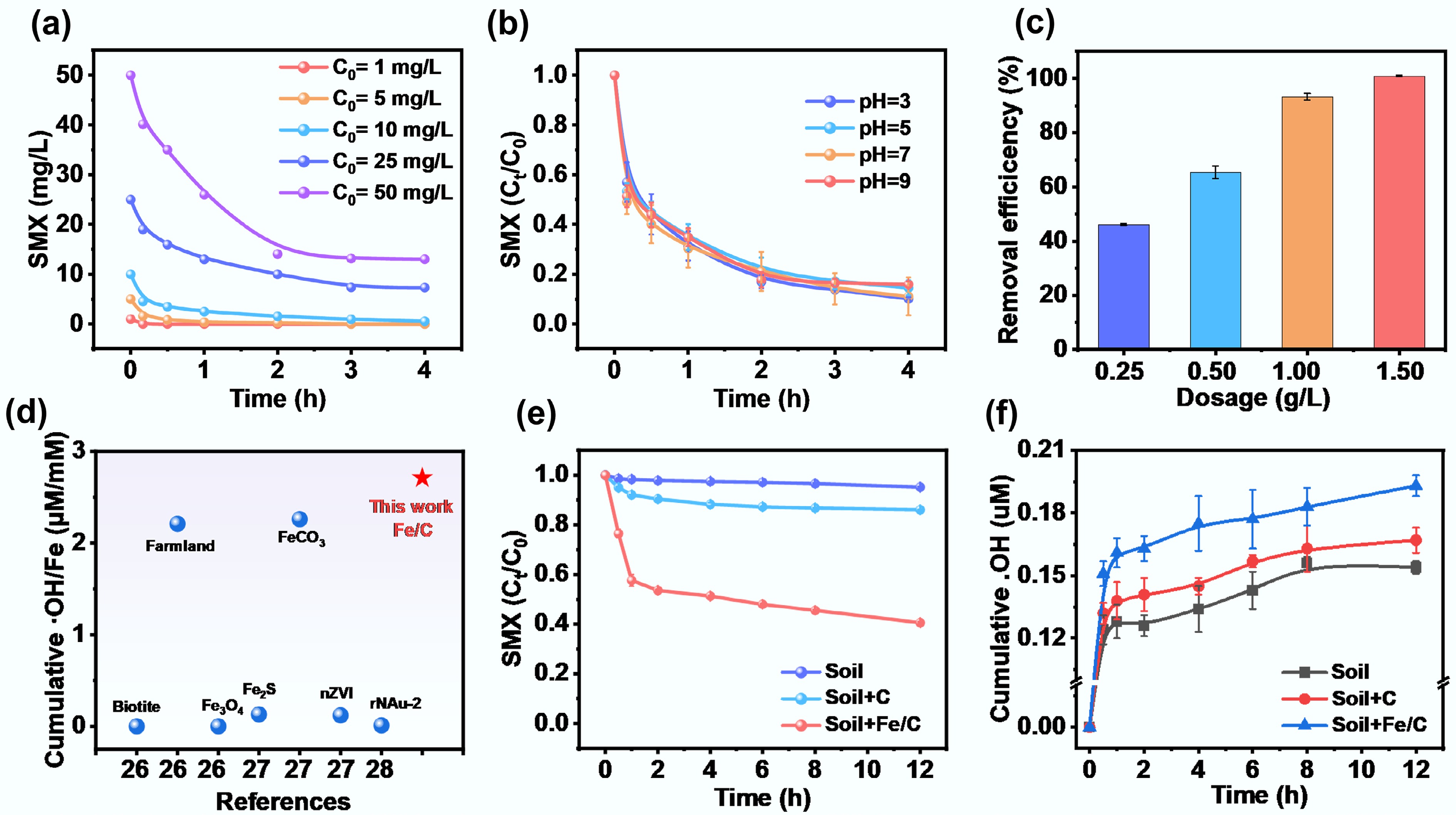 (a) Effect of initial SMX concentration on the performance of Fe/C-250V composite catalyst for SMX removal (Reaction conditions: SMX = 1−50 mg/L, Fe/C-250V catalyst = 1.0 g/L, pH = 7, temperature = 298 K). (b) Effect of pH on the performance of Fe/C-250V composite catalyst for SMX removal (Reaction conditions: SMX = 10 mg/L, Fe/C-250V catalyst = 1.0 g/L, pH = 3−9, temperature = 298 K). (c) Effect of different dosages of Fe/C-250V composite catalyst on SMX removal efficiency (Reaction conditions: SMX = 10 mg/L, Fe/C-250V catalyst = 0.25−1.50 g/L, pH = 7, temperature = 298 K). (d) Comparison of cumulative •OH/Fe with other previous reported materials in the literature. More details can be found in Supplementary Table S1. (e) SMX removal performance and (f) Cumulative •OH generation kinetics of Fe/C-250V composite catalyst in aqueous solutions containing cinnamon soil (Reaction conditions: SMX = 20 mg/L, Fe/C-250V composite catalyst or carbon substrate = 1.0 g/L, cinnamon soil = 100 g/L, pH = 7, temperature = 298 K).