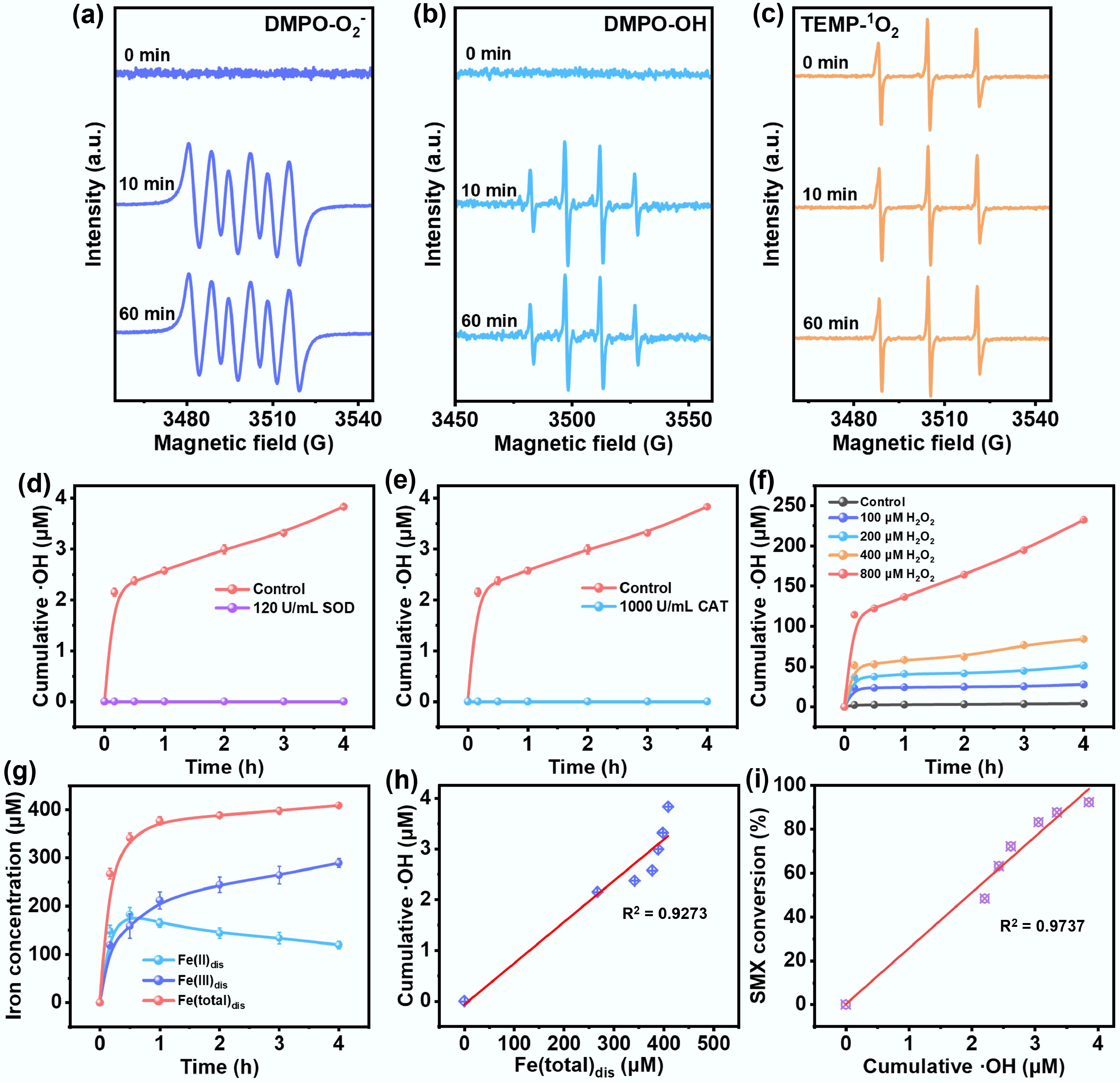 Electron paramagnetic resonance (EPR) spectra recorded for the reactive oxygen species (a) O2•−, (b) •OH, and (c) 1O2 from the reaction of Fe/C-250V composite catalyst with oxygen. Cumulative concentrations of ·OH produced by Fe/C-250V composite catalyst after the addition of (d) 1,000 U/mL CAT and (e) 120 U/mL SOD. (f) Cumulative concentrations of •OH after the addition of different concentration of H2O2. (g) Evolution of dissolved Fe species. (h) The line fit of •OH concentration and total dissolved Fe. (i) The line fit of •OH concentration and SMX removal (Reaction conditions: SMX = 10 mg/L, Fe/C-250V catalyst = 1.0 g/L, pH = 7, temperature = 298 K).