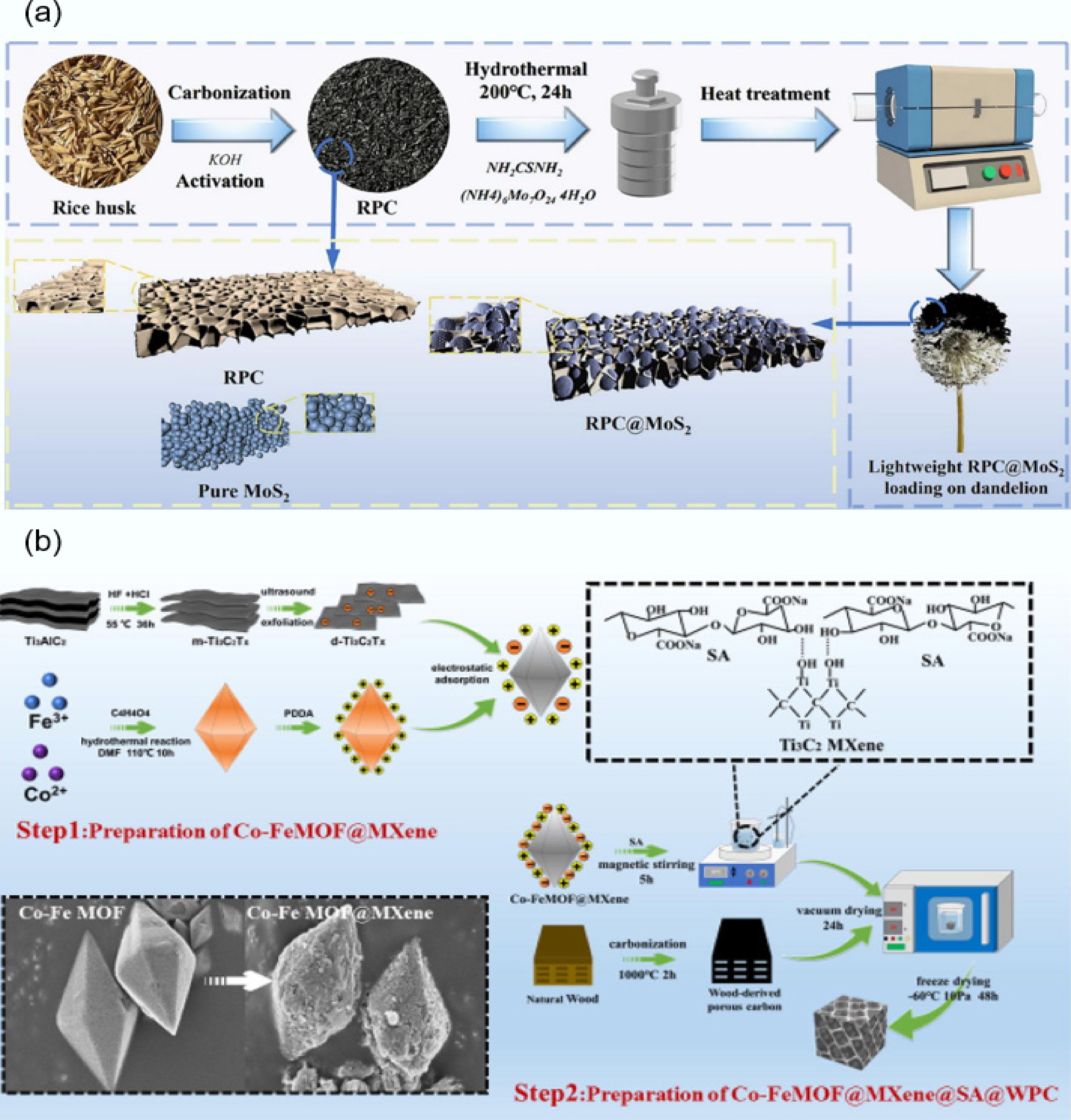 (a) Schematic diagram of the synthesis process of RPC@MoS2 composite[261]. (b) Schematic diagram of the synthesis process of CoFe-MOF@Ti3C2TxMXene@SA@WPC[260].