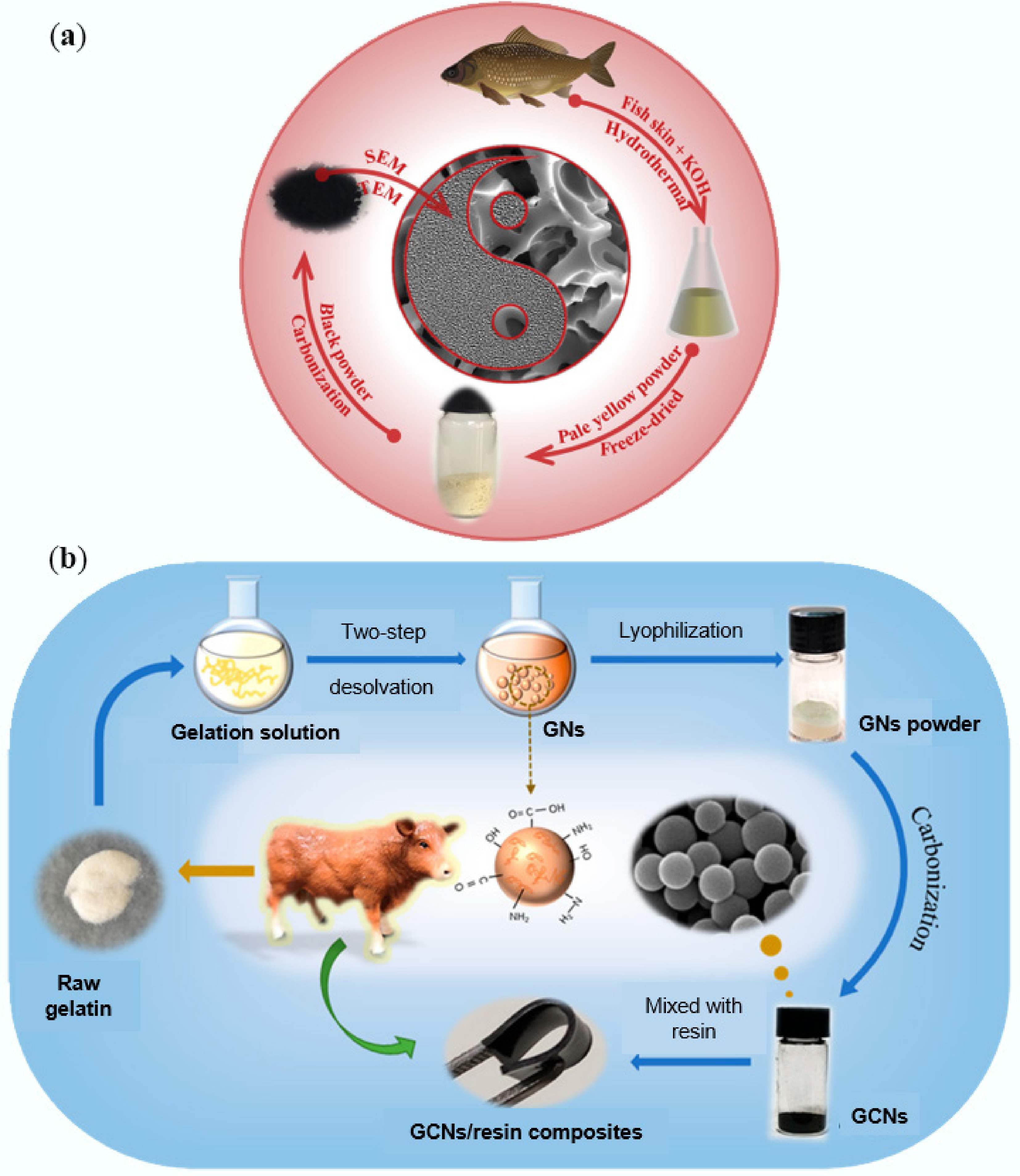 (a) Synthesis of heteroatom doped biochar from fish skin[263]. (b) Schematic illustration of the preparation process of gelatin-based carbon nanospheres[238].