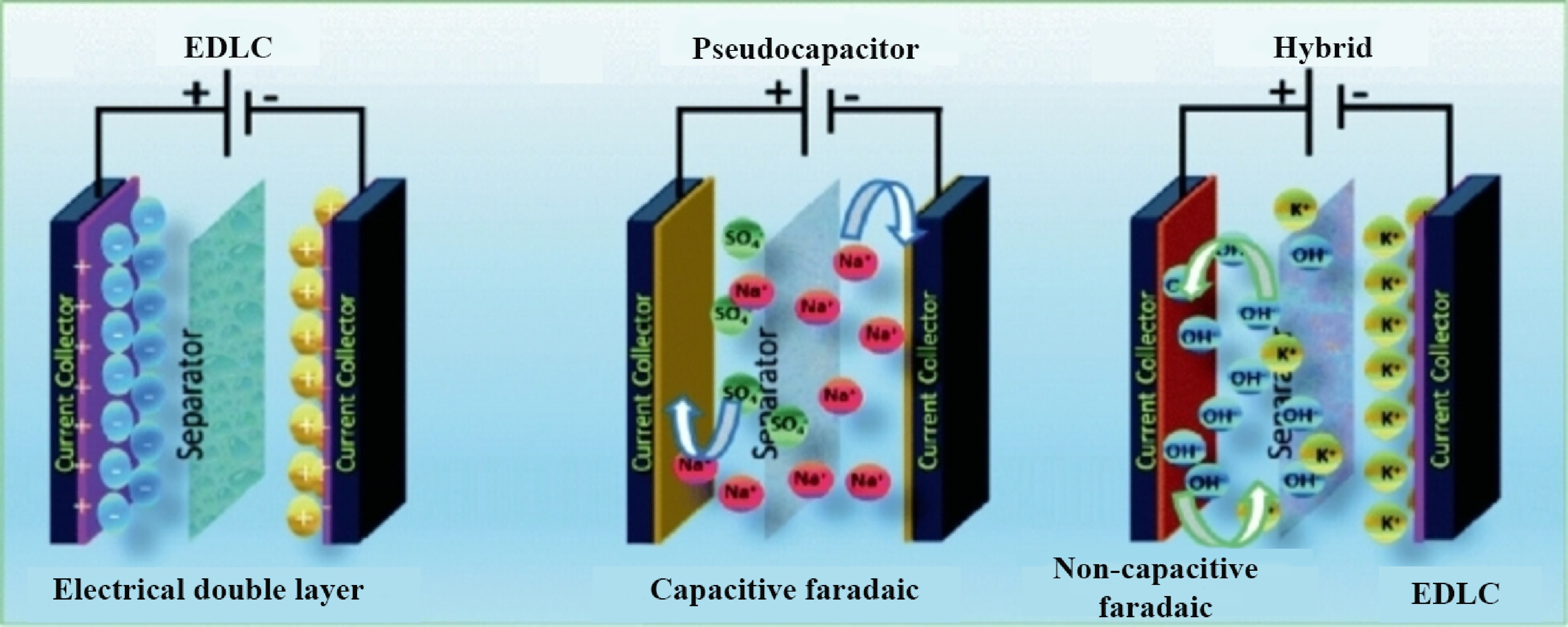 Types of supercapacitors - EDLC, pseudo capacitor, hybrid[311].