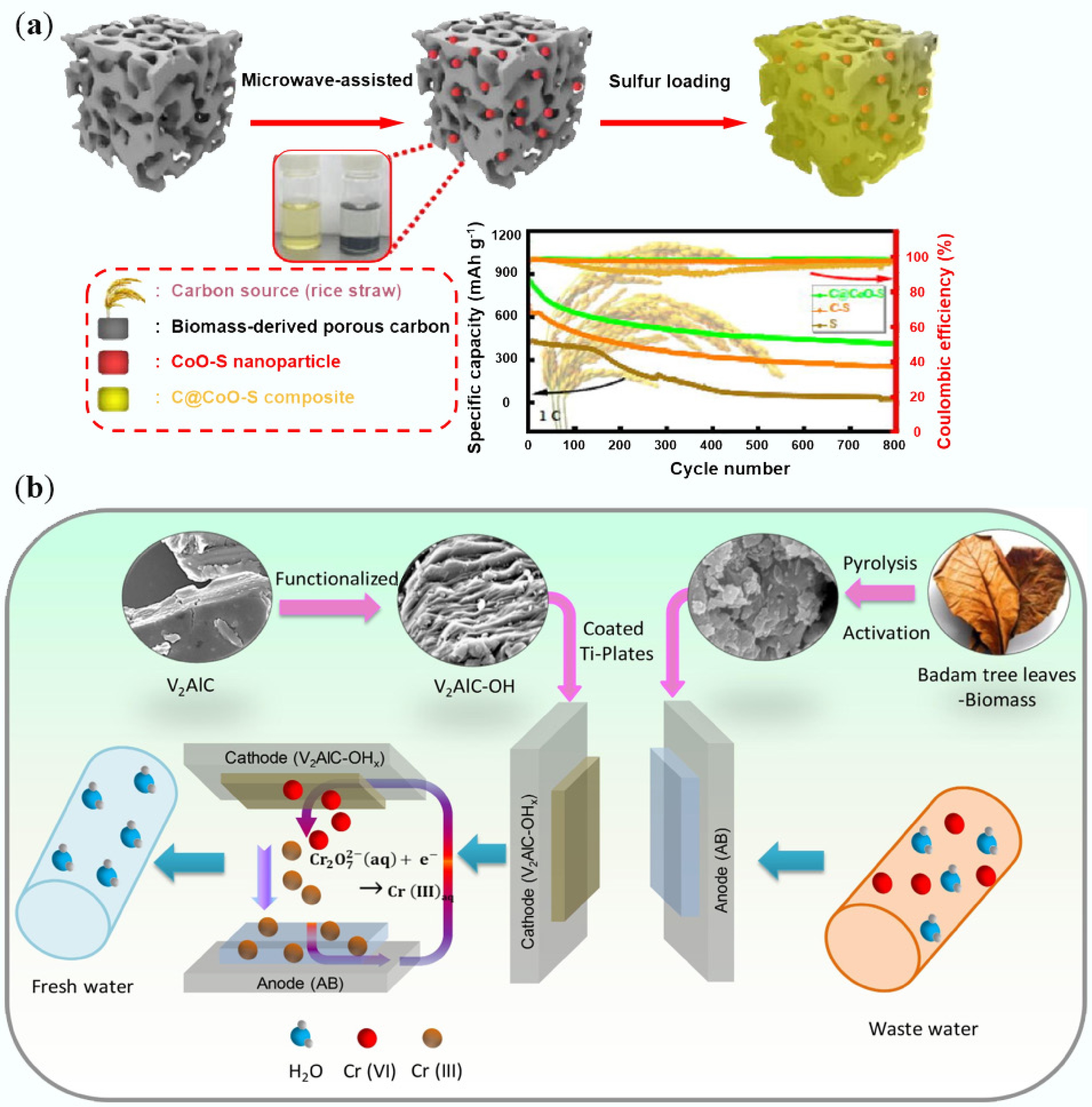 (a) Schematic diagram of the preparation of biochar electrodes modified by sulfur/CoO nanoparticles[318]. (b) Schematic illustration of the asymmetric CDI setup, and the Cr(VI) reduction mechanism using AB/V2AlC-OHx electrodes[319].