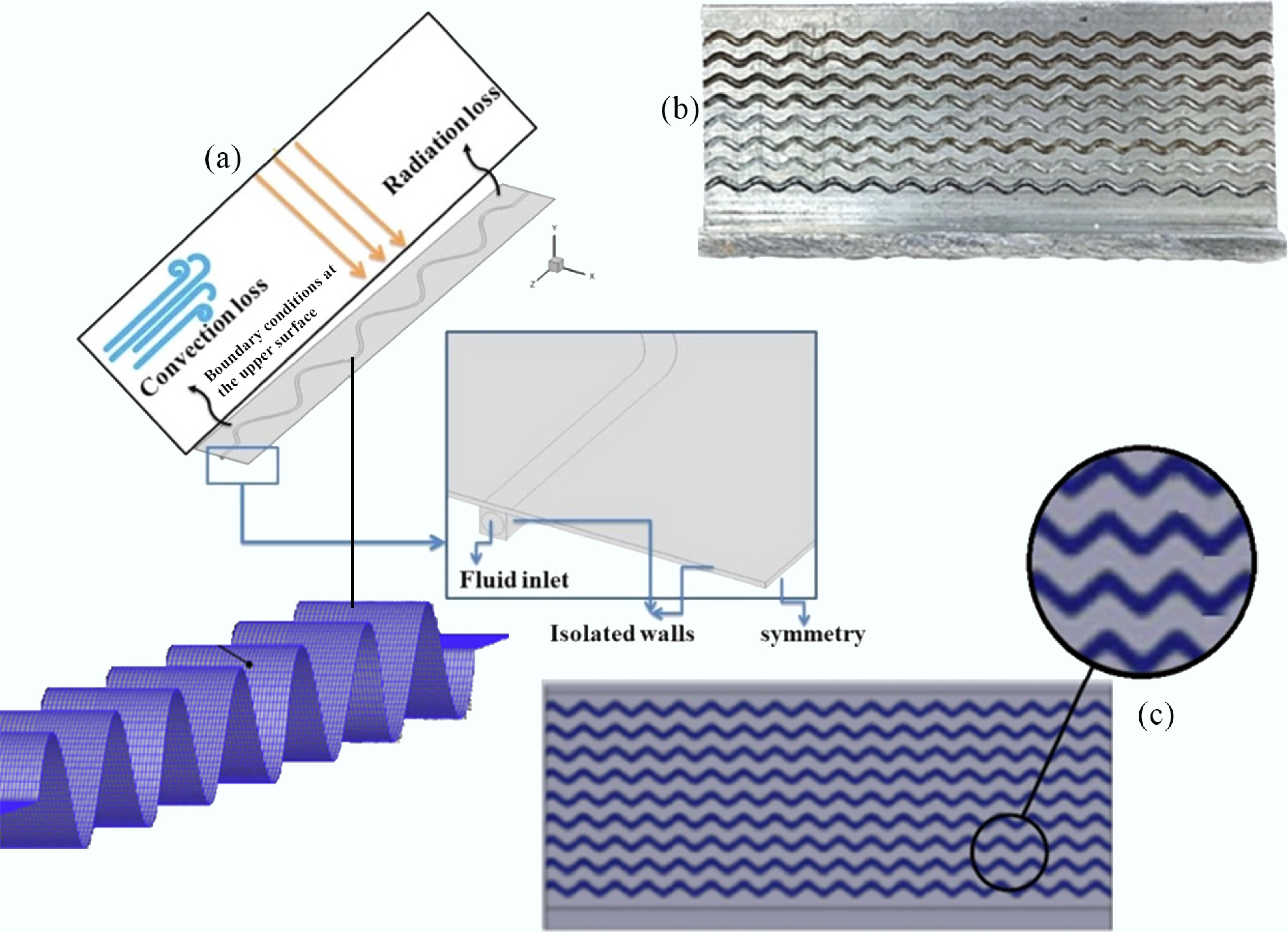 Schematic representation of the physical model and computational domain with a sinusoidal surface. (a) Heat transfer mechanisms and loss components. (b) Boundary conditions and symmetry setup. (c) Overall system configuration.