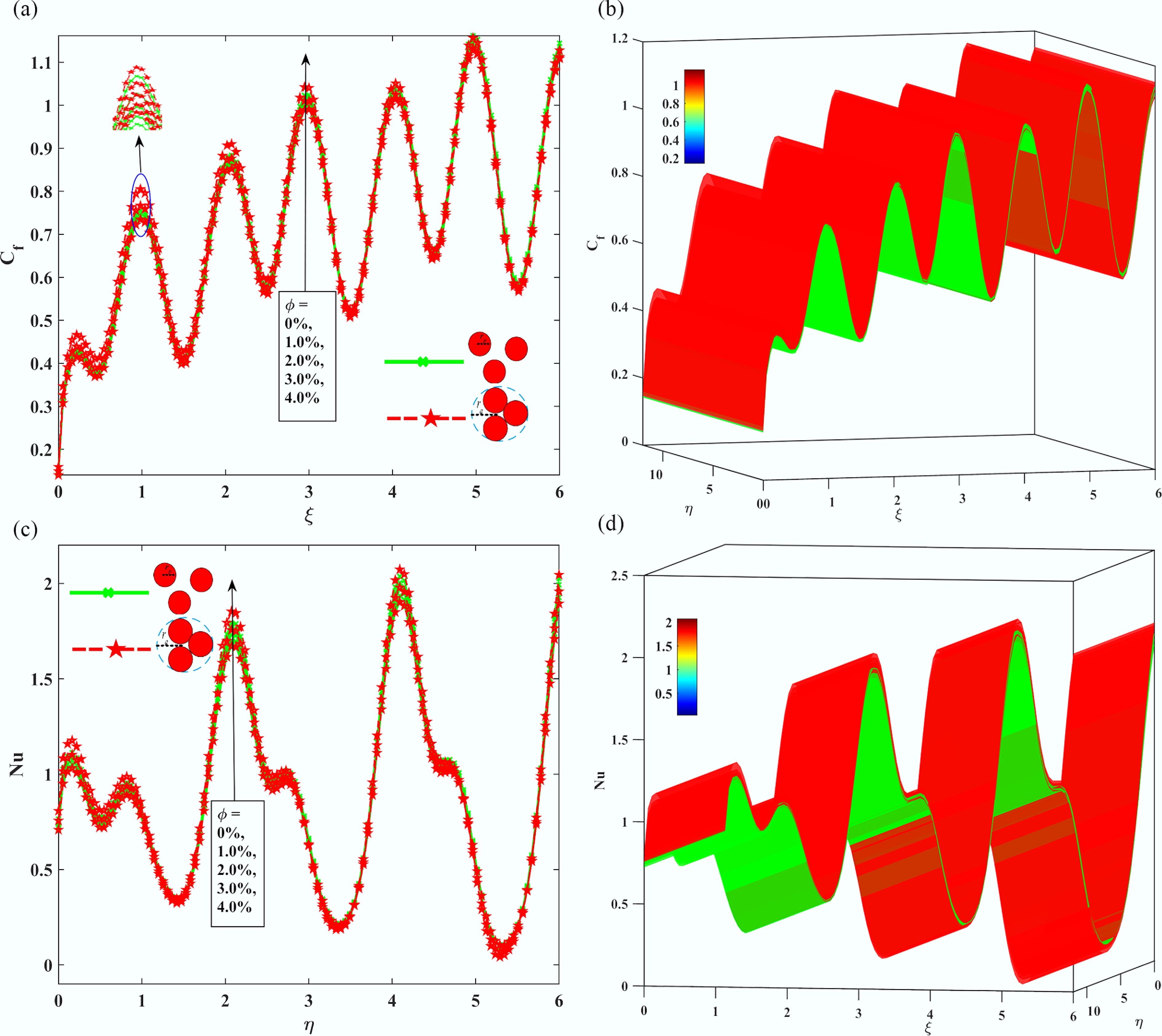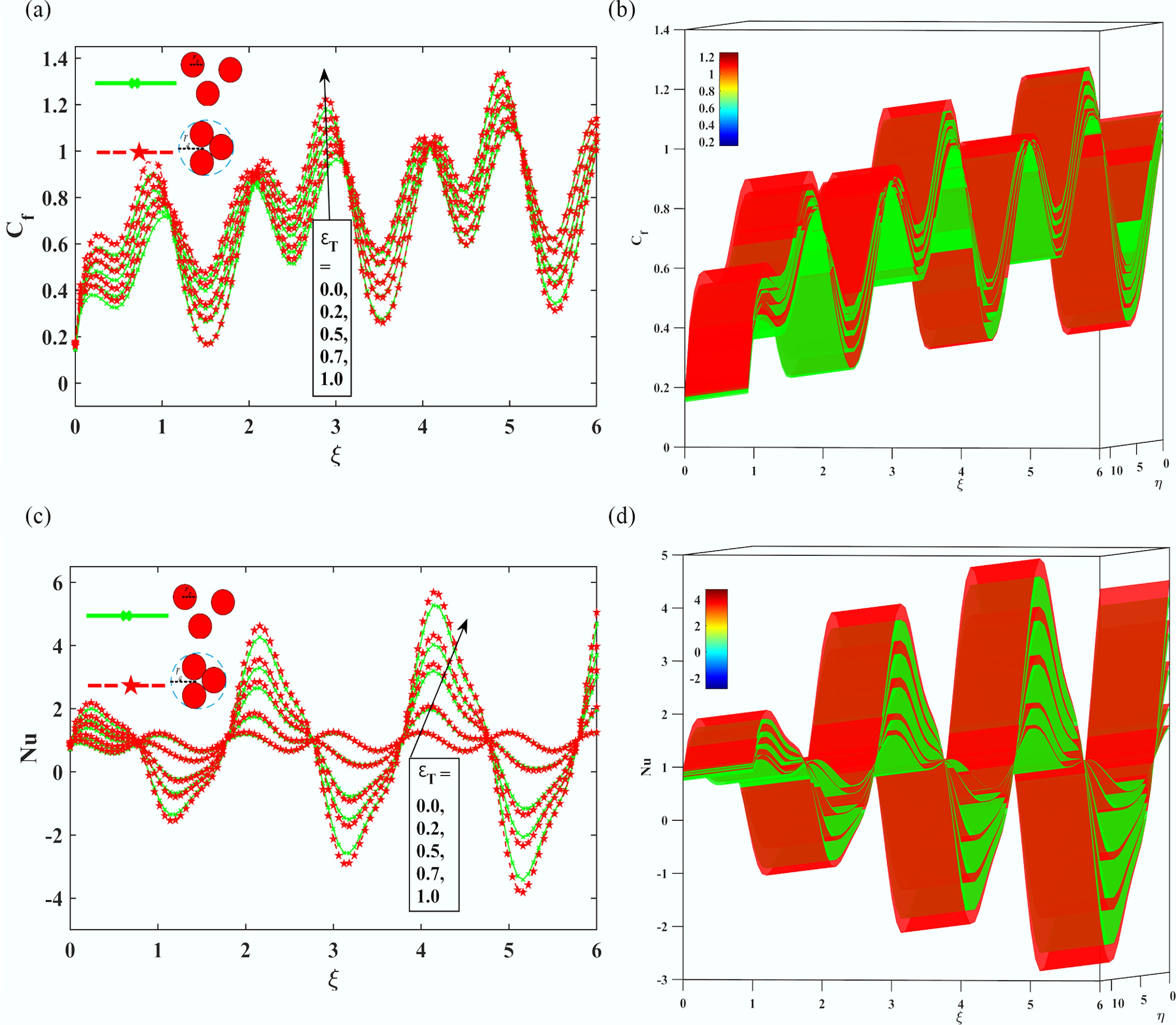 The Impact of sinusoidal boundary parameter $ {\varepsilon }_{T} $, on (a), (b) skin friction coefficient Cf, and (c), (d) local Nusselt number Nu.
