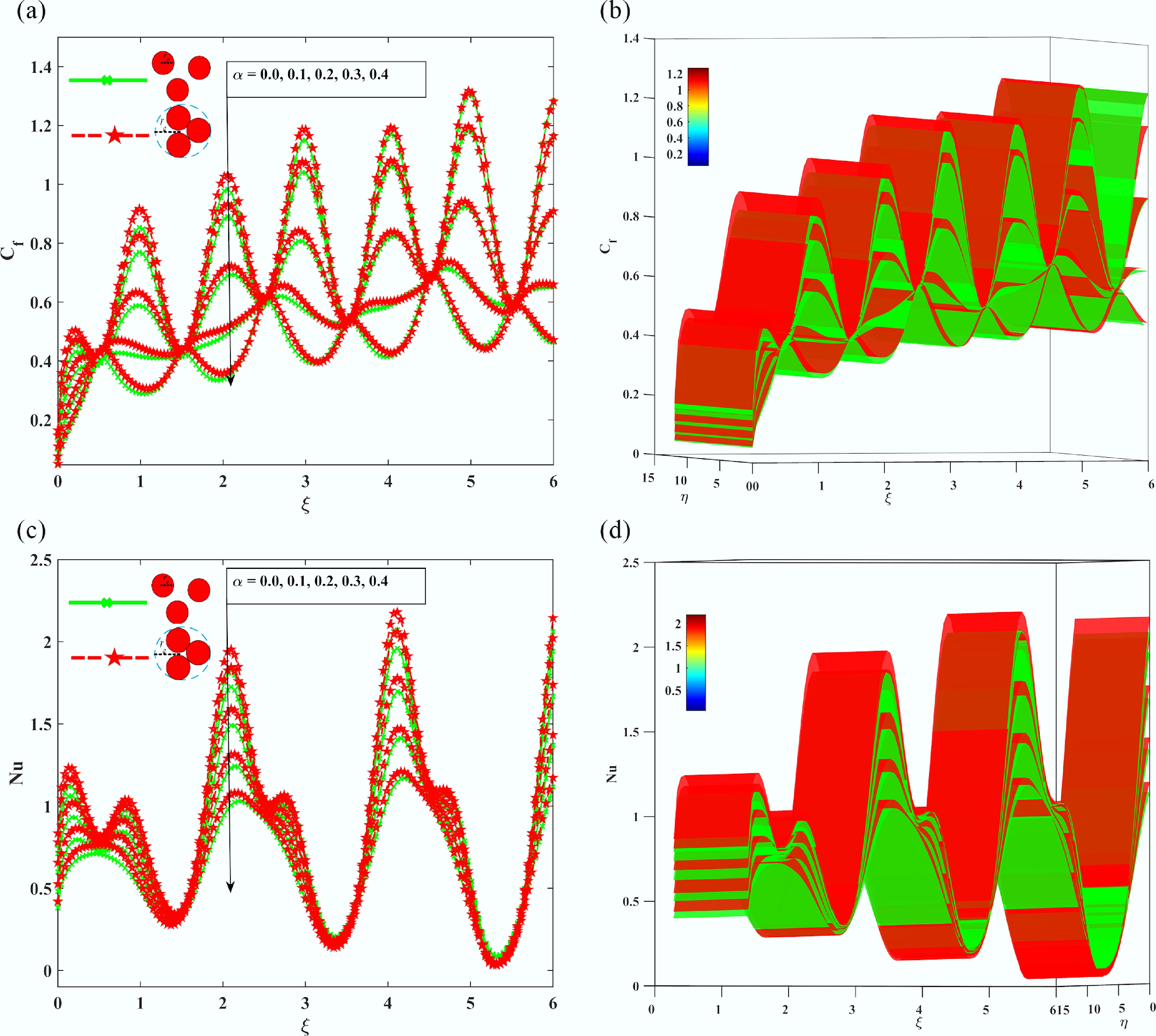 The Impact of the wavelength ratio parameter $ \alpha $, on (a), (b) Skin friction coefficient Cf, (c), (d) local Nusselt number Nu.