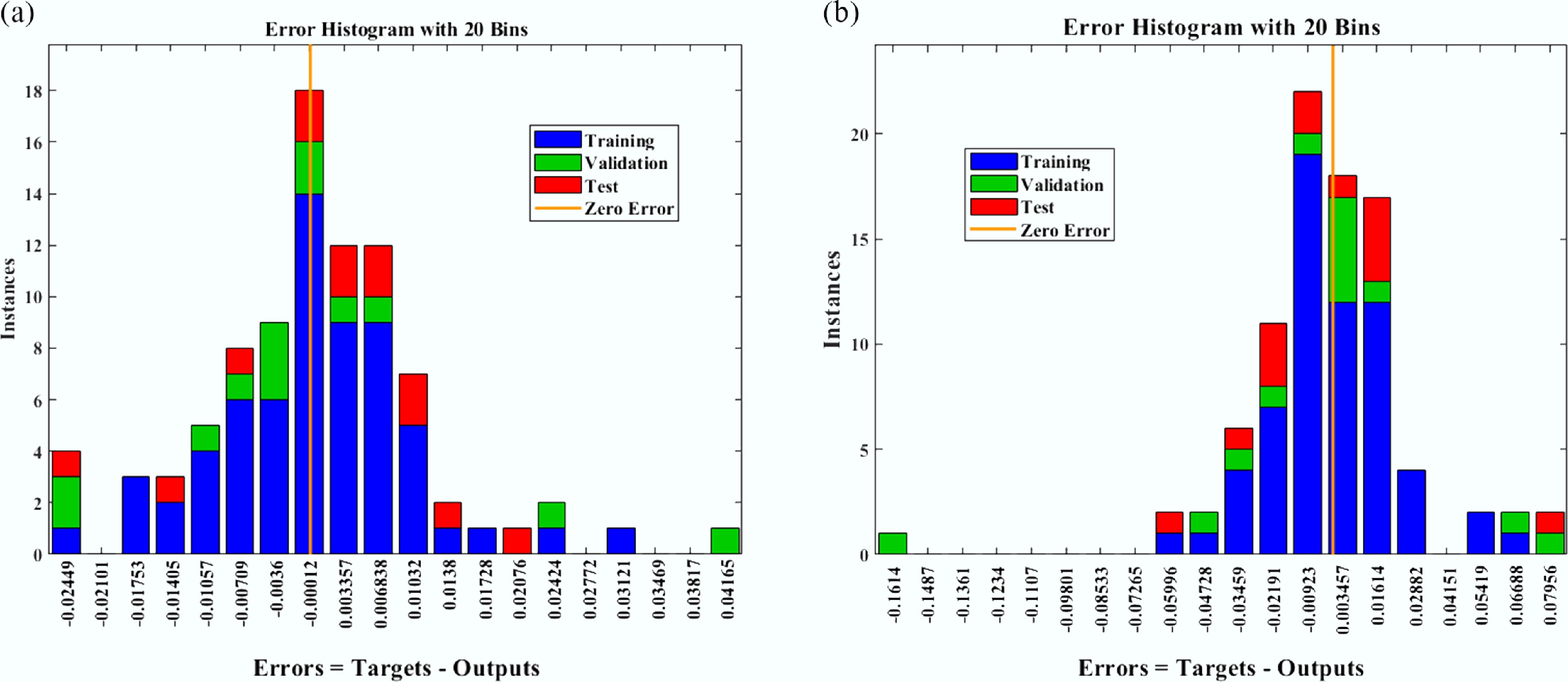 Error histogram analysis for Nusselt number (Nu) vs sinusoidal parameter ($ {\varepsilon }_{T} $) for comparing: (a) non-aggregated, and (b) aggregated nanoparticle configurations.