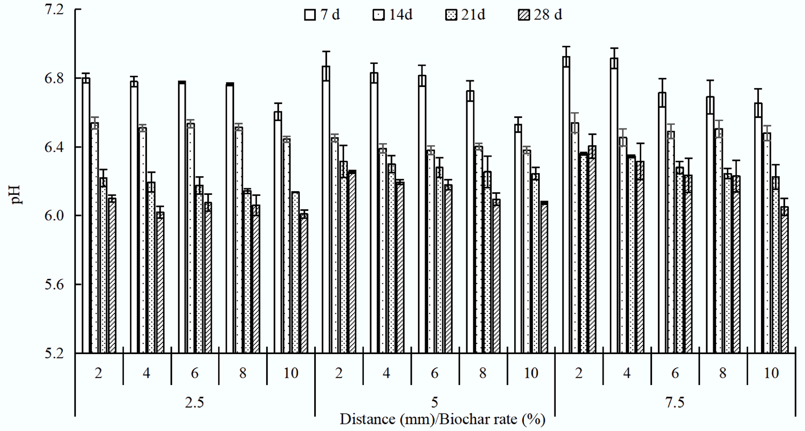 • All biochar treatments increased soil pH in the charosphere compared with the non-charosphere (10 mm), with larger increases at higher application rates (Fig. 1). The pH increased by 0.02–0.20 (2.5% biochar), 0.01–0.34 (5% biochar), and 0.01–0.36 (7.5% biochar) units in the charosphere during 28 d. Biochar effects extended to 10 mm in heavy metals-polluted soil, and higher application rates provided more alkaline ions, which were the primary reason for the pH increase. The pH decreased with increasing distance from the charosphere and decreased by 0.02–0.20 (2.5% biochar), 0.16–0.76 (5% biochar), and 0.18–0.60 (7.5% biochar) units over a longer cultivating period during 28 d. The 3% biochar treatment also raised soil pH and thereby reduced heavy-metal mobility[13]. Wang et al.[9] also reported that the pH of all biochars declined by the end of the experiment, followed by a secondary slow decrease. Meng et al.[5] also observed that charosphere soil pH increased after application of swine-manure-derived biochar to Cd-polluted soil.