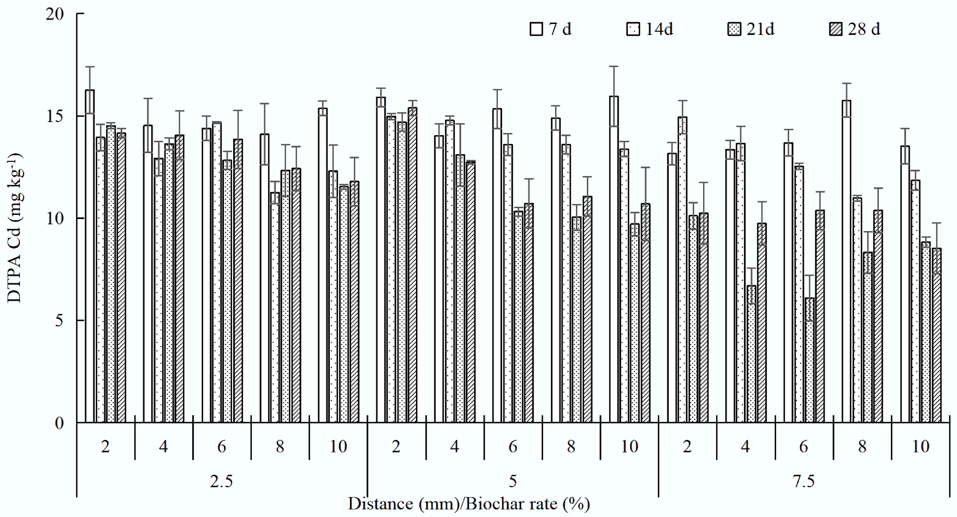 • Biochar reduced bioavailable Cd concentrations in the 2-mm charosphere by 10.7%–14.2% (2.5%), 3.2%–7.6% (5%), and 0%–7.6% (7.5%) over 28 d (Fig. 2). The effects of biochar on the immobilization of Cd in soil were indicated by monitoring the concentrations of DTPA-extractable Cd. Compared with the control (CK), the DTPA-extractable Cd in the charosphere soil decreased significantly and then remained stable during the 28 d. In the first 7 d, biochar clearly reduced the DTPA-extractable Cd in the charosphere soil. Then the concentrations rose to steady values of approximately 0.7, 0.8, and 0.11 mg kg−1, respectively, with swine manure biochar at pyrolysis temperatures of 300, 500, and 700 °C. In another experiment, the levels of DTPA-extractable Cd in biochar were decreased by 37.5%, relative to the CK[9]. The unstable Cd species (acid-soluble and reducible fractions of Cd) also decreased with successive cultivation, increasing the biochar ratio in the soil[14].