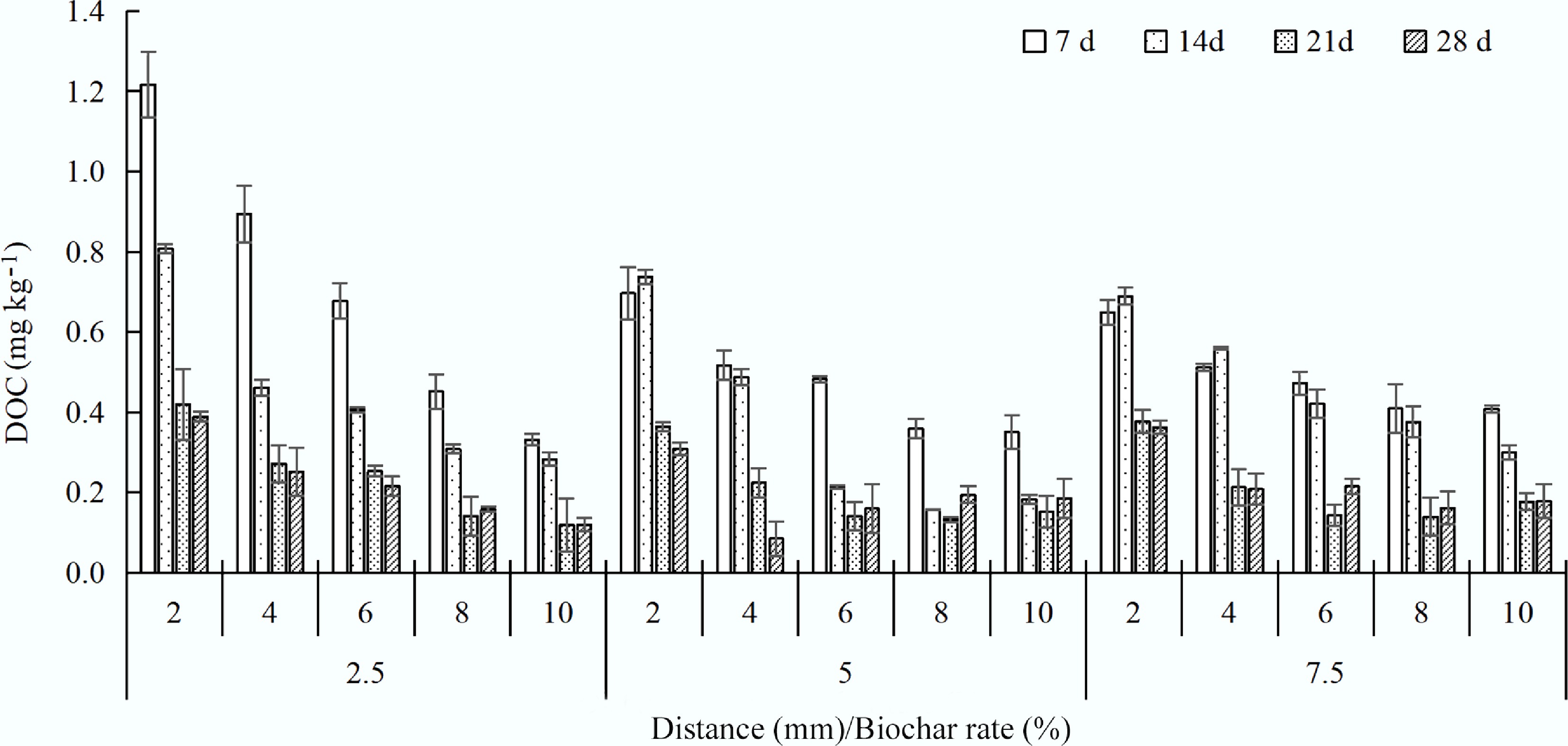 • Dissolved organic carbon (DOC) is considered the most mobile fraction of organic matter, consisting of organic components of varying molecular weights from biochar, which was correlated with the solubility of heavy metals in soil[17]. DOC concentration decreased with increasing distance from charosphere in solution, which also decreased over time compared with 7 d (Fig. 3). The increased DOC was mainly from the charosphere, which was greatly decreased by 14.7%–72.5% (7 d), 16.0%–71.7% (14 d), 33.4%–71.5% (21 d), and 31.8%-69.1% (28 d) from 2 to 10 mm. Easily degradable DOC was likely consumed by microorganisms or naturally degraded, with over 50% degradation in 28 d compared to 7 d. DOC was also related to biochar type; the soil DOC contents of peanut shell biochar and rice husk biochar in all the treatments were significantly increased by 11%–27% and 7%–36%, respectively, compared with the control treatment[18]. The corn straw-derived biochar also increased DOC by 197.50% at 90 d in peatland soil[19]. Xue et al.[2] also found that the contents of total carbon (TC) increased by 6.36% compared with the control. The humic-like substances in BC-derived DOC affected the composition of soil DOC and effectively reduced Cd bioavailability[20].