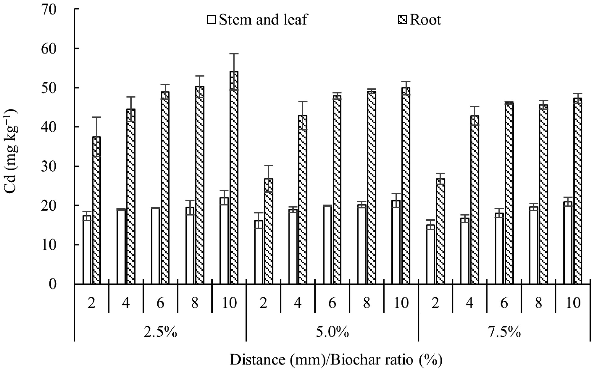 • Figure 4 shows the Cd concentration gradient in wheat shoots and roots. Both tissues exhibited a clear decline in Cd with increasing biochar application rate and distance from the charosphere. Relative to the 10 mm position, shoot Cd reduced by 5.3%–28.3% and root Cd by 2.3%–46.3% across the 2–8 mm zone. At 2 mm from the charosphere, 5% and 7.5% biochar lowered shoot Cd by 7.1%–28.5% and root Cd by 28.5%–31.2%. This protective effect weakened progressively with distance, confirming that biochar immobilization operates over a few millimeters. Consistent with the data, Li et al.[21] reported that increasing biochar from 0% to 3% decreased the Cd bio-accumulation factor from 5.84 to 3.80. The reduced upward translocation of Cd is ascribed to (1) enhanced soil fixation (42.8%–59.5% of total Cd converted to residual phases) and (2) the electron-donating capacity of biochar that limits Cd solubility[22]. Consequently, shoot Cd accumulation in wheat dropped by 42%–47% after biochar amendment, a response linked to a higher soil pH (8.6–9.6) and a 30%–45% decrease in CaCl2-extractable Cd in the 0–20 cm layer[23].